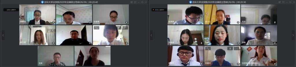 严肃紧张,温暖活泼,师生共迎培养质量考核关。6月2日至6月3日,223名答辩员工正式进行网络答辩。本次答辩共组成12个答辩委员会,委员60人次,其中伟德国际bevictor1946教师48人次,外请专家12人次。外请专家均由实务经验丰富、实践能力突出的法官、检察官和天津天关律师事务所、吉林全策律师事务所、吉林集成律师事务所律师担任,对法律硕士学位论文中的实践方面与实务问题进行评议,彰显了法律硕士专业型研究生的特色。答辩过程中,先由导师以各种方式介绍所指导研究生基本情况与论文写作情况,再由答辩员工详细汇报论文研究问题、研究方法、主要内容、重点难点、创新之处与研究结论等方面,最后进入问答环节,答辩员工对答辩委员会提问做出回答。在本组全部员工答辩完成后,答辩委员会进行独立视频合议,对学位论文进行投票,做出是否通过答辩的决定,并推选本组优秀论文。