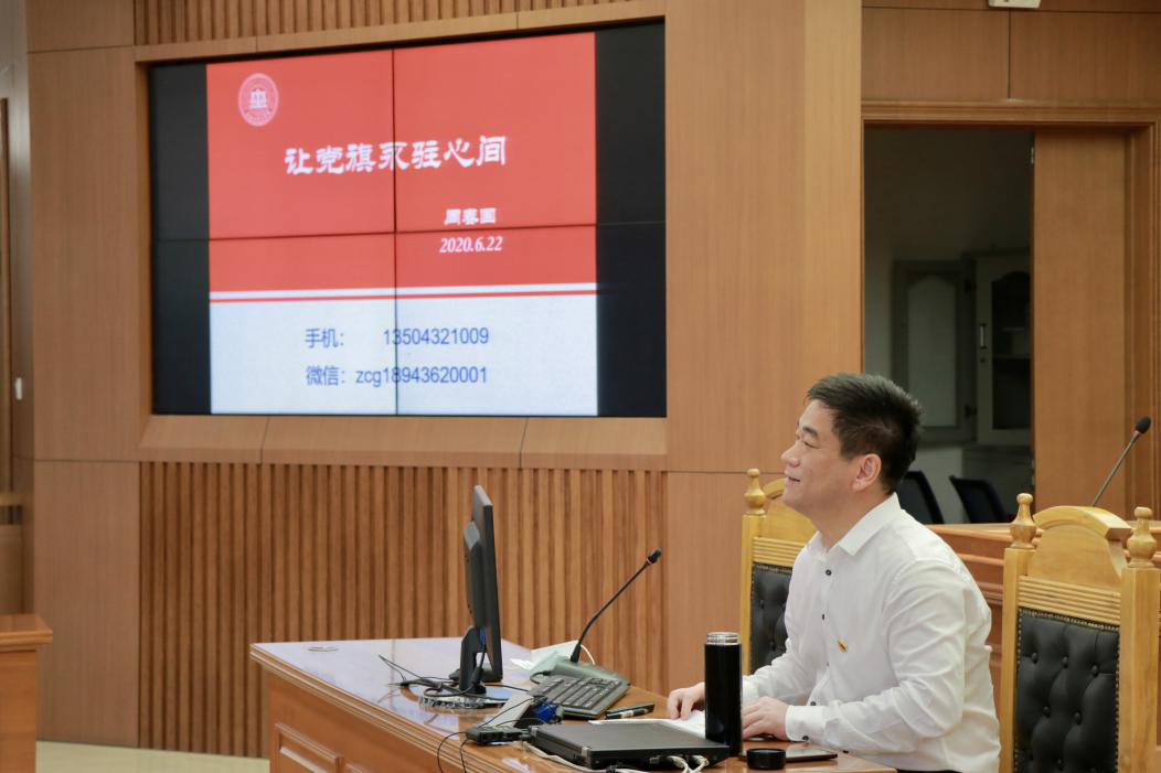 周春国以“让党旗永驻心间”为题,从疫情让世界认识中国和中国共产党为切入点,从“站位新时代,涵养政治视野”、“立足新起点,涵养政治品格”、“担当新使命,涵养政治定力”三方面,阐明了中国特色社会主义的制度优势和文化优势,勉励毕业生党员要涵养胸怀天下的气度、坚韧不屈的风骨、自信从容的风度、辩证思考的智慧和敢于担当的勇气,做公平正义的捍卫者、廉洁自律的表率者、保持警惕的清醒者,鼓励员工担起使命与责任,毕业后不能放松政治进步和业务学习。同时,周春国还表达了对同学们的殷切期望,希望同学们在以后的人生道路中,以习近平新时代中国特色社会主义思想为指导,把自身的发展融入到民族复兴的伟大事业当中,矢志不渝,努力奋斗。
