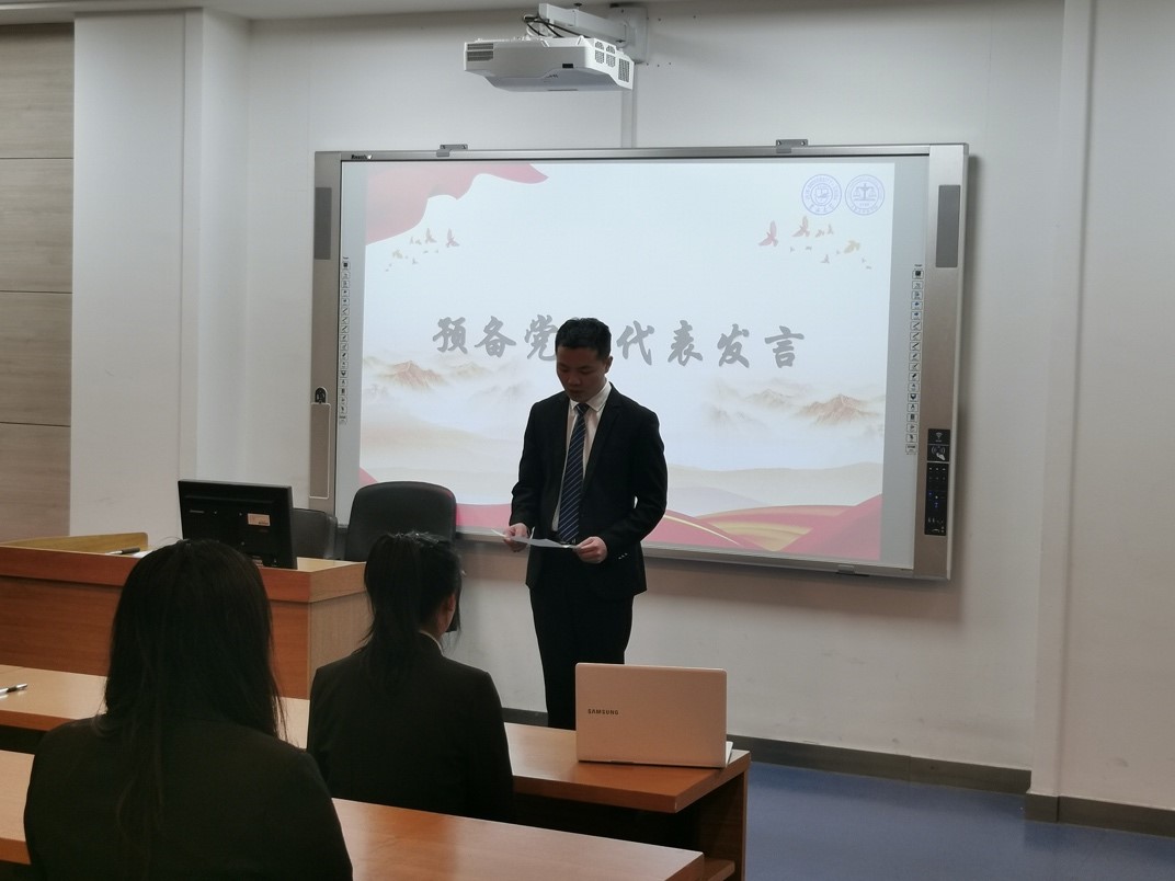 仪式开始,全体起立,奏唱国歌。随着庄严肃穆的国歌声结束,宣誓开始。新党员们在领誓人乔敬时同志的带领下举起右手,握拳,面对党旗,庄严宣誓。2018级法学硕士方进同志作为新党员代表发言。他代表新党员们承诺:将入党誓词作为自己终身的追求和实践,不忘初心,砥砺前行,做到无论在任何情况下都要保持好党员的先进性,发挥好党员的先锋模范作用。