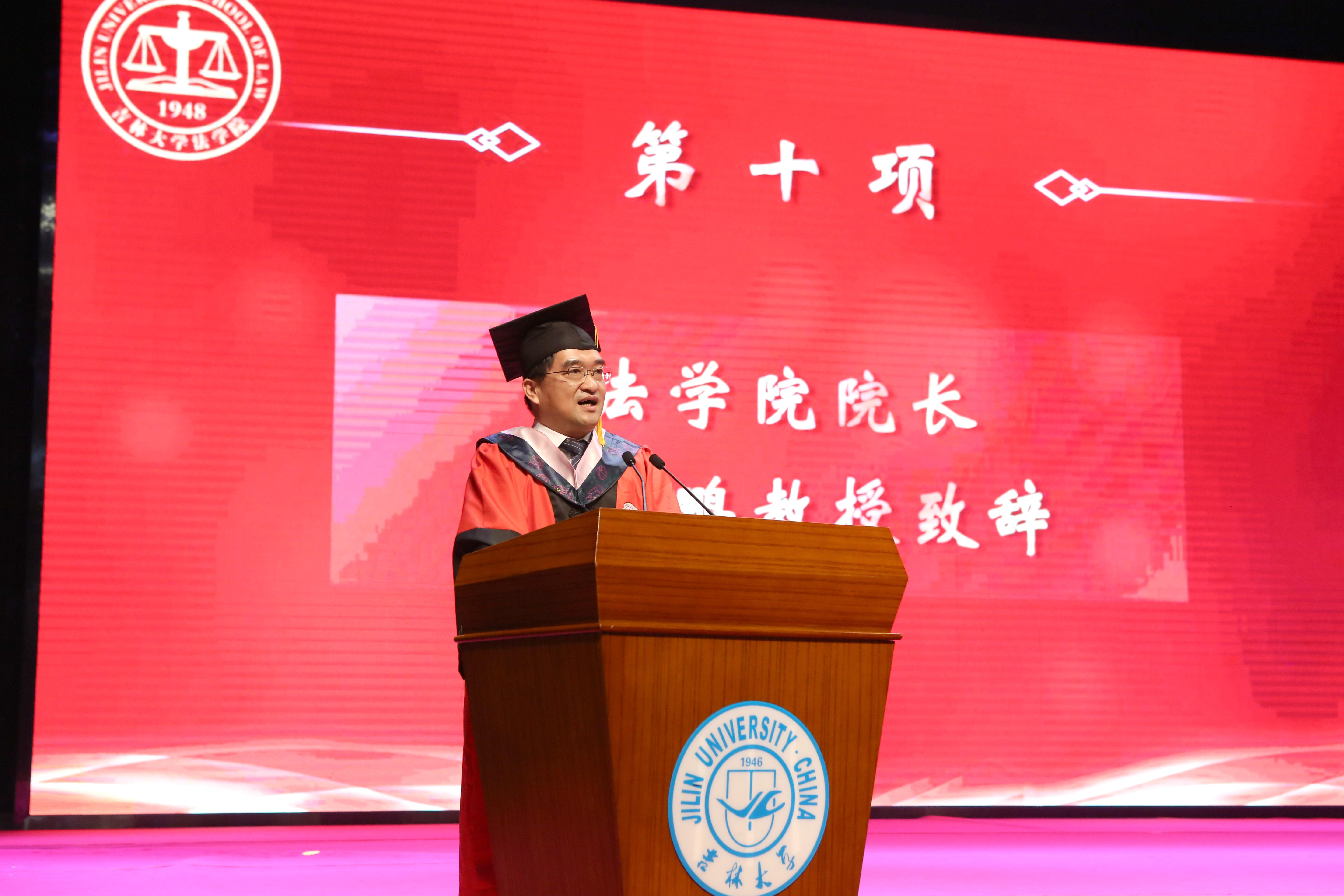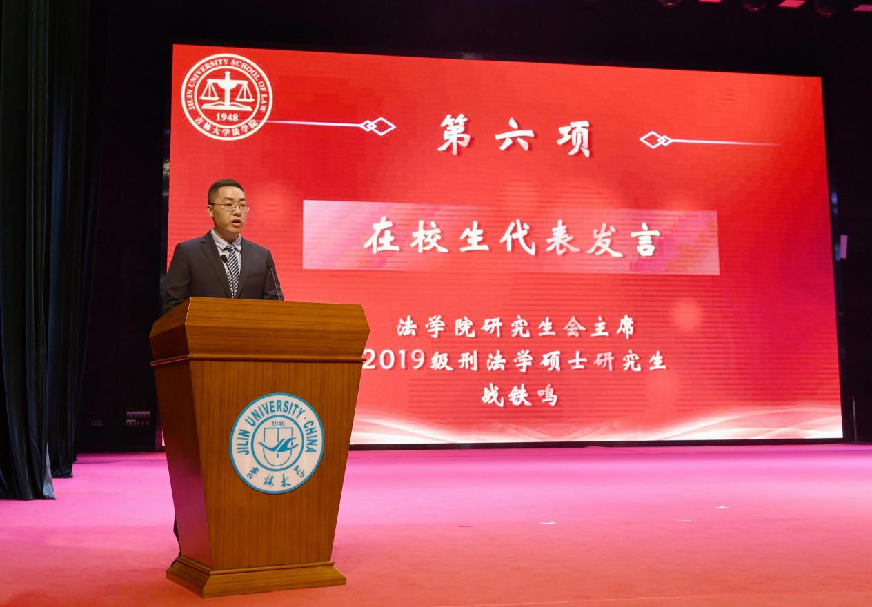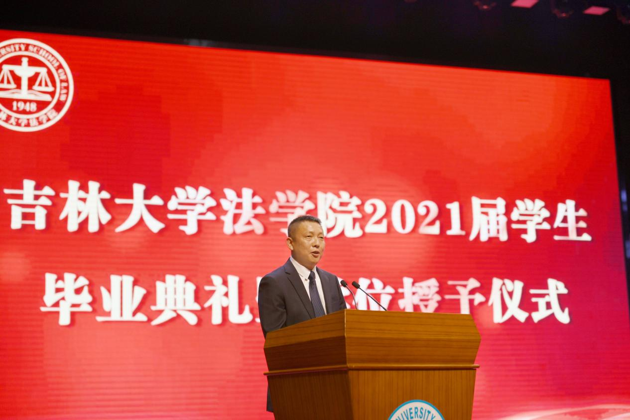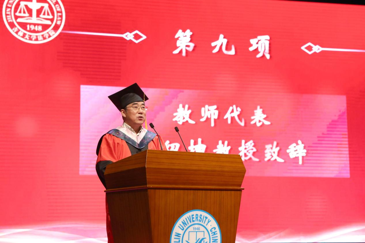校务委员会副主任,财产法研究中心主任房绍坤教授作为教师代表致辞。他以“风物长宜放眼量”为主题,与同学们分享了对当代社会“内卷”与“躺平”的看法。他勉励同学们要放眼将来,志存高远,拒绝“内卷”与“躺平”,带着吉大法学的荣耀与希望,奔赴自己的星辰大海。