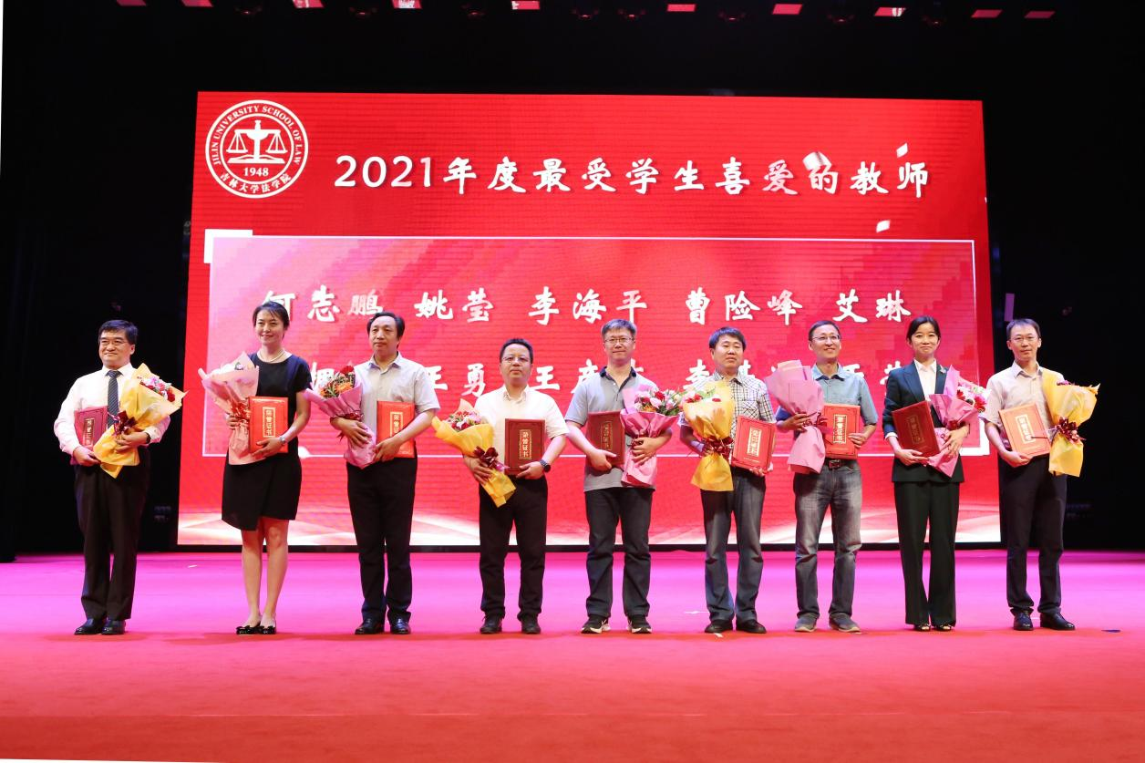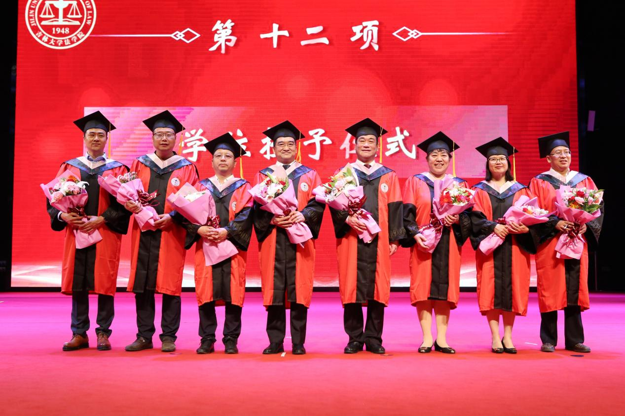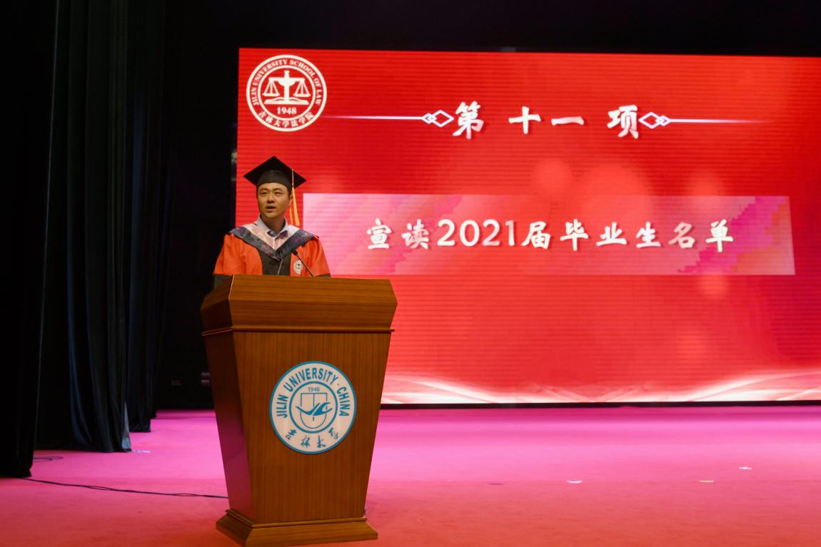 副经理刘晓林教授宣读毕业生名单后,经理何志鹏教授、公司党委书记周春国教授、法学学位评定分委员会副主席张旭教授、校政策与法规办公室主任任喜荣教授、理论法学研究中心主任兼副经理杜宴林教授、副经理曹险峰教授、王充教授、刘晓林教授等八位主礼教授登台为毕业生拨穗授位,获得学士、硕士、博士学位的2021届毕业生们依次登台接受拨穗礼。