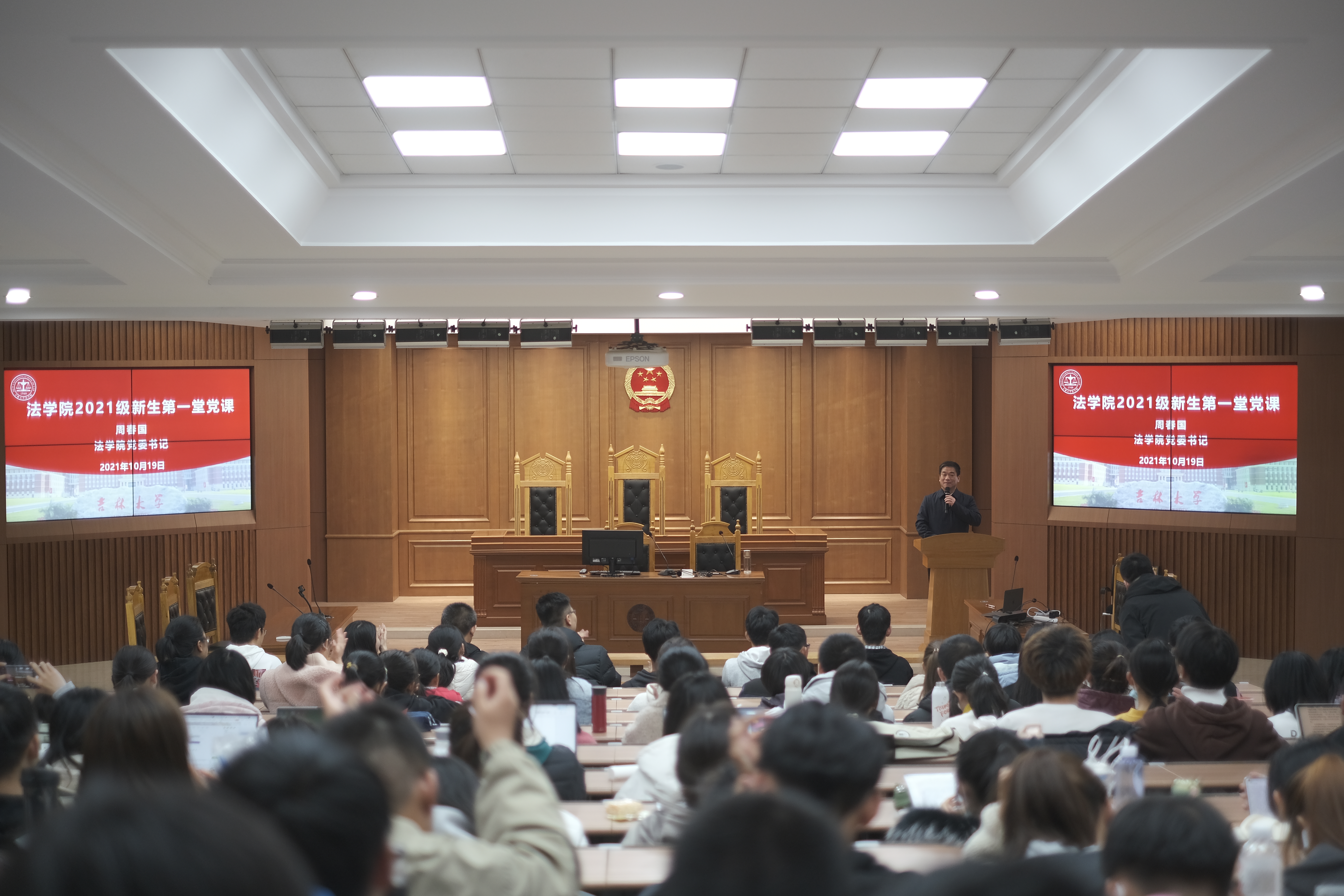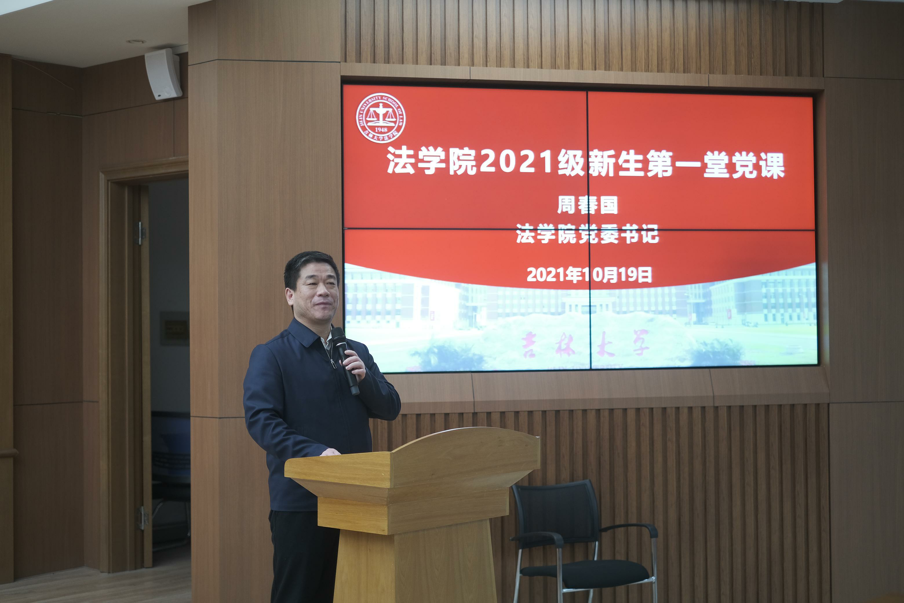 2021年10月19日18点30分,2021级新生在三教五阶迎来了第一堂情怀深厚、激荡人心的党课。法公司党委书记周春国以“明德笃行、隆法致公,做吉大法学精神的弘扬者”为题,引导新生树立爱党爱国意识,激励同学们培养开拓进取的理想信念,做勇担时代使命的吉大法学人。法公司党委副书记兼副经理林媛媛参加本次党课,课程由伟德国际bevictor1946团委书记、2021级辅导员赵昊骏主持。
