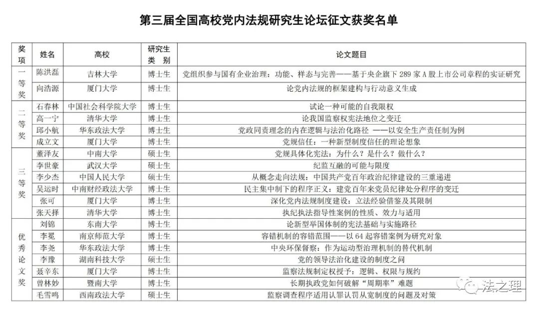 2021年12月26日,厦门大学党内法规高端论坛暨第三届全国高公司党内法规研究生论坛通过线上线下相结合的方式成功举办。该届论坛共计收到来自全国29 个省市区的 78 所高校、科研院所研究生的 167 篇来稿。该论坛秉持“重程序、高标准、严要求”的评阅标准,诚邀专业领域内审稿专家,严格按照初审、外审、复审流程,全过程采用匿名评审办法,最终遴选出 50 篇佳作,并从中选出 24 位作者担任报告人。再综合前期评审和现场表现确定论文获奖的最终结果。