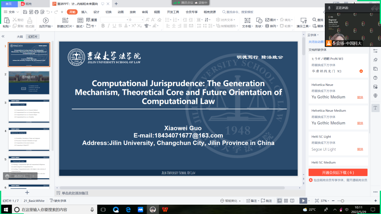 公司2021级法学理论专业硕士研究生郭小伟同学,以“Computational Jurisprudence: The Generation Mechanism, Theoretical Core and Future Orientation of Computational Law”为题,应邀以Poster形式在“Computational social sciences issues”专题中作演讲,和与会者展开讨论。郭小伟同学以其长期担任清华大学智能法治研究院研究助理的实践经历,结合其自身所学专业从法学理论的视角对计算法学的生成机理、理论内核和未来面向作了详细报告。