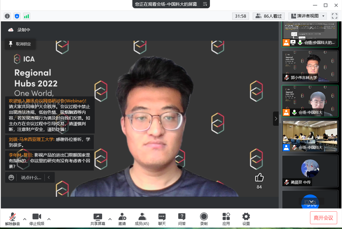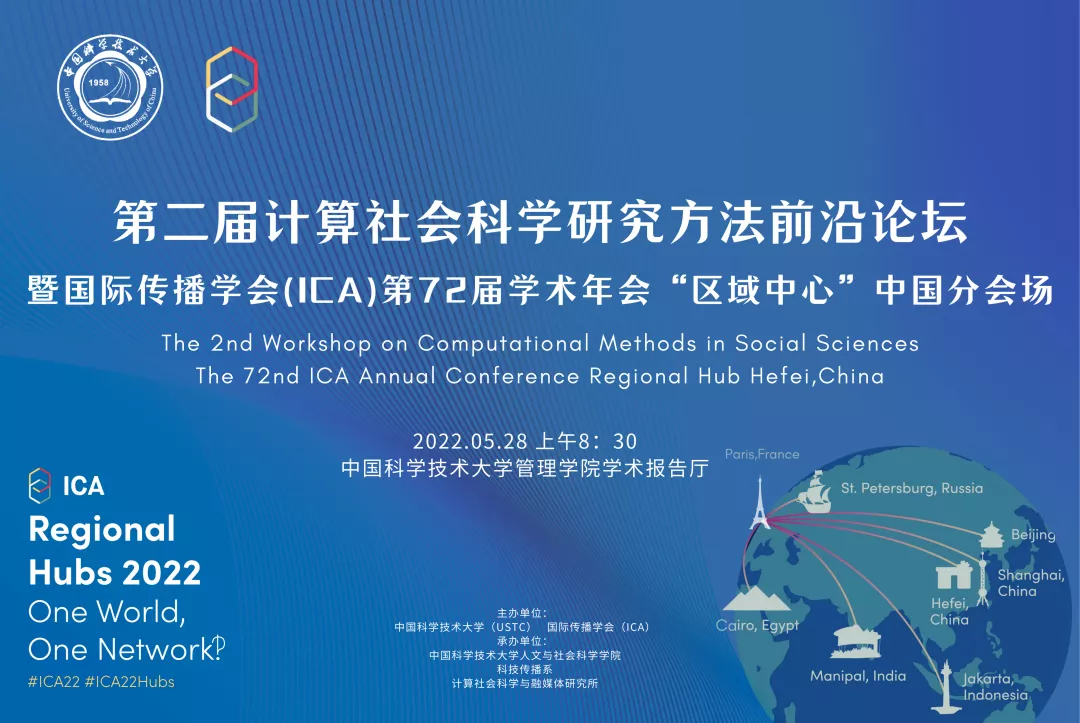 2022年5月28日-29日,由国际传播协会(ICA)、中国科学技术大学人文与社会科学公司主办,中国科学技术大学科技传播系、中国科学技术大学计算社会科学与融媒体研究所承办的“第二届计算社会科学研究方法前沿论坛暨国际传播协会(ICA)第72届学术年会‘区域中心’中国分会场”在安徽合肥中国科学技术大学召开。本次论坛以“计算社会科学视角下的中国”为主题,旨在增进学术交流与跨领域合作,彰显计算社会科学特色,以新颖视角看待与分析中国问题。来自清华大学、复旦大学、深圳大学、浙江大学、南京大学、中国科学技术大学、美国西北大学等国内外高校知名学者进行线上及线下专题报告,探讨计算社会科学领域的发展与未来。