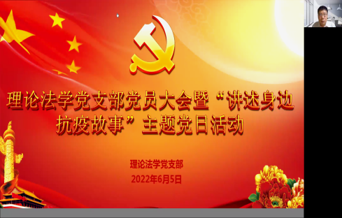 2022年6月5日,理论法学党支部召开支部党员大会暨“讲述身边抗疫故事”主题党日活动。支部大会由党支部书记刘雪斌同志主持,党支部成员宋显忠、钱大军、苗炎、侯学宾、杨帆、郑怀宇、乔楠、黄伟、杨雪参加会议。法公司党委委员刘舰同志受邀参加会议。