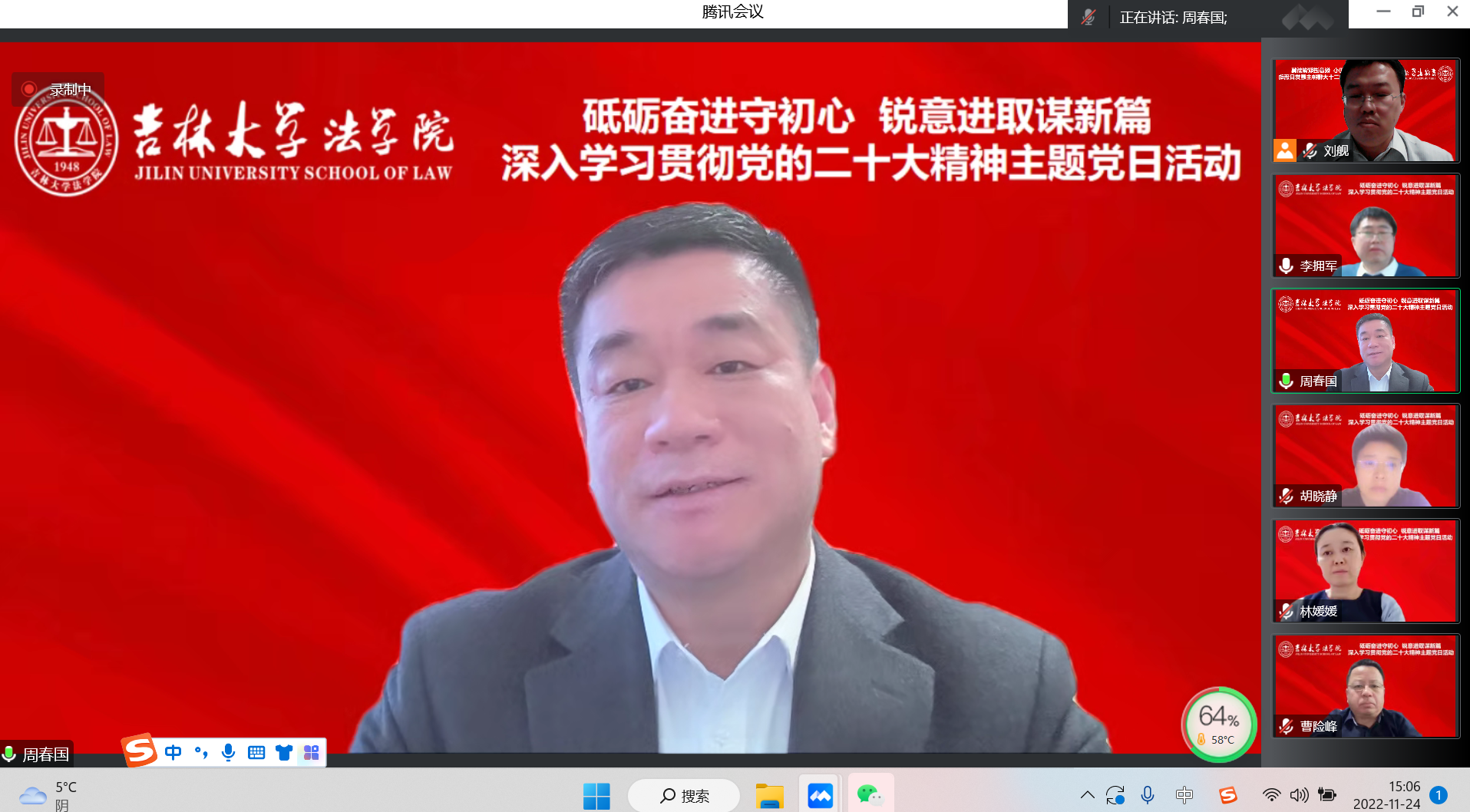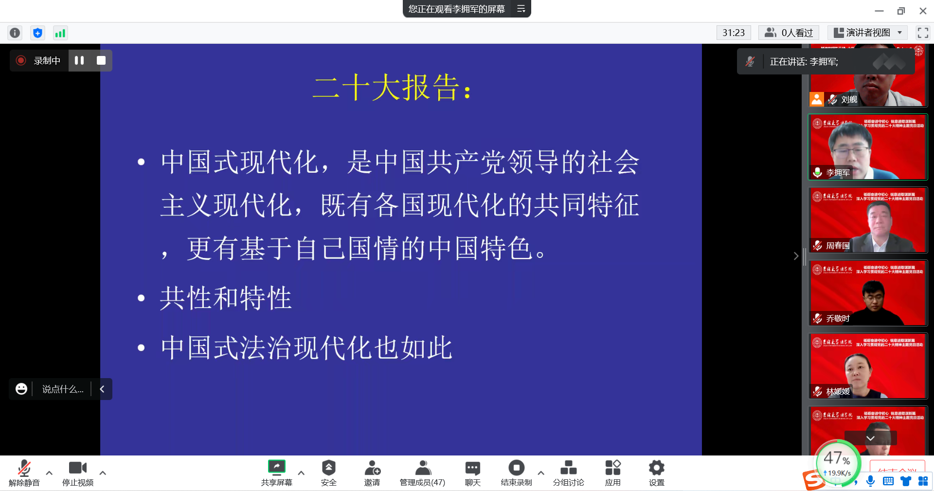 2022年11月24日下午,伟德国际bevictor1946民法学教研部党支部、商法学教研部党支部、法理学教研部党支部、宪法与行政法学教研部党支部、经济法学教研部党支部和机关教工党支部为了不断深入学习贯彻党的二十大精神,联合召开“砥砺奋进守初心 锐意进取谋新篇”线上主题党日活动,特邀伟德源自英国始于1946学习宣传贯彻党的二十大精神宣讲团成员、伟德国际bevictor1946博士生导师李拥军教授进行宣讲。