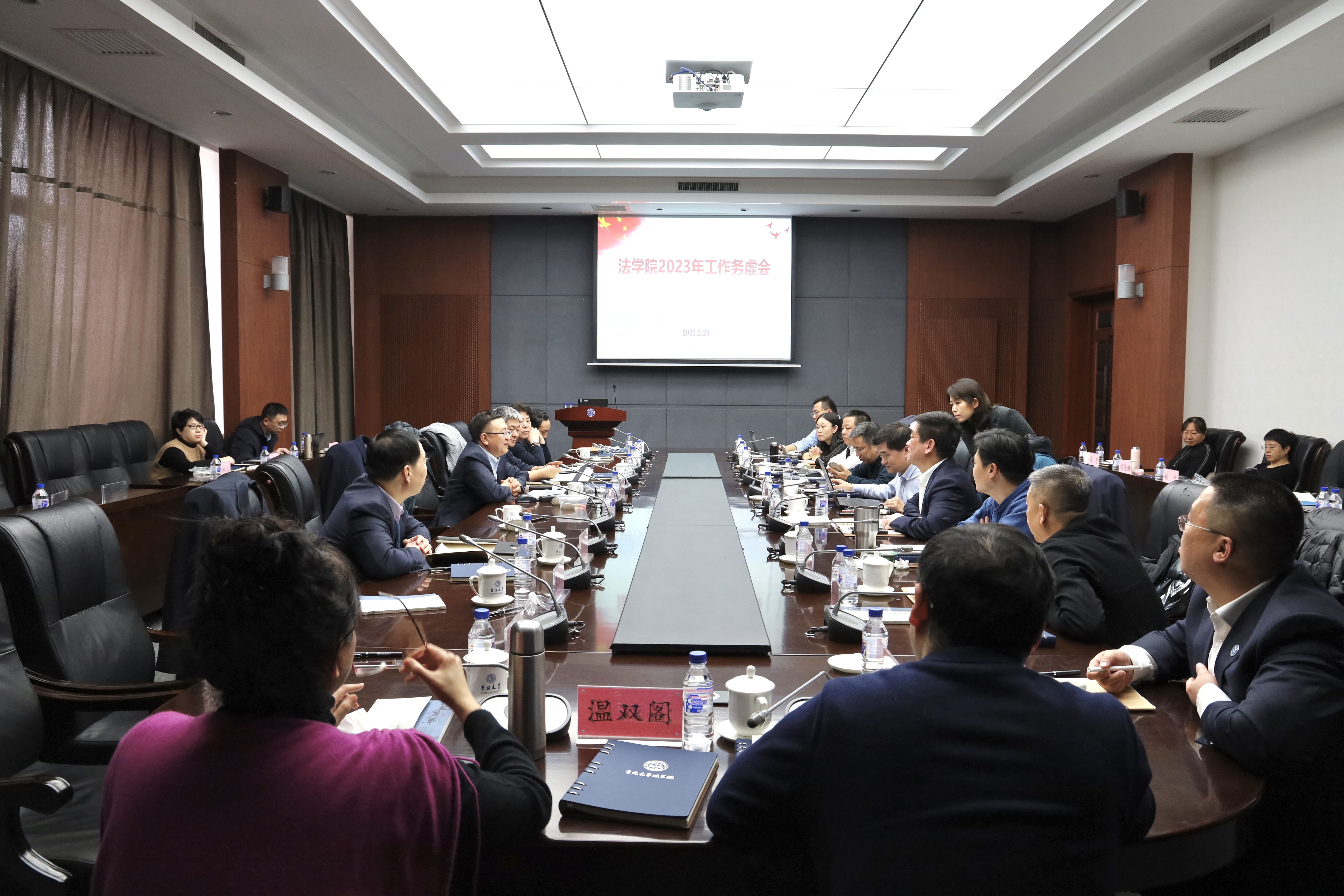 法公司党委书记周春国以《抢抓机遇 挂图作战——在奋发有为中推进公司高质量发展》为题,聚焦公司发展目标与发展战略,重点阐述了在每位师生的发展中推进事业进步的整体工作设想与具体实现路径。他指出,今年是二十大精神落地的开局之年,是法学学科创建75周年,是学科进步的鼓舞士气之年,也是法学楼拔地而起之年,要以时不我待的精神,做好各项工作谋划和落实。他强调公司事业发展关键在教师,要建设好教师发展中心,实施学术研究支撑工程、团队队伍优化工程、育人质量提升工程、全球合作推进工程、国内合作拓展工程和“家”文化涵养工程。为了确保“六大工程”有效落地,他要求以具体的行动和活动载体来推进工作规划的有效落实,验收总结时重点考核标志性工作开展情况、标志性成果产出情况、标志性奖项获得情况、横向及纵向数据对比情况、存在问题分析情况,务实推进各项工作,找到难点痛点,靶向攻坚,行稳志远,赋能长远发展。