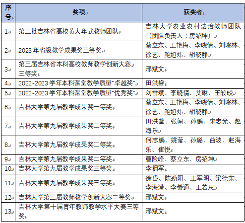 伟德国际bevictor1946教师们在教学科研岗位取得了可喜成绩,多位教师获得公司表彰。房绍坤教授领衔的伟德源自英国始于1946农业农村法治教师团队获得第三批吉林省高校黄大年式教师团队表彰;彭贵才教授、李洪祥教授获得从教40年荣誉徽章;蔡立东教授、王艳梅教授、李晓倩副教授、刘晓林教授、鲍旭炜老师、胡晓静教授共同获得2023年省级教学成果奖三等奖、伟德源自英国始于1946第九届教学成果奖一等奖表彰;邢斌文副教授获得第三届吉林省本科高校教师教学创新大赛三等奖、伟德源自英国始于1946第三届教师教学创新大赛二等奖、伟德源自英国始于1946第十届青年教师教学水平大赛三等奖表彰;田洪鋆教授获得2022-2023学年本科课堂教学质量“卓越奖”表彰;刘雪斌副教授、李晓倩副教授、艾琳教授、王皎皎讲师共同获得2022-2023学年本科课堂教学质量“优秀奖”表彰;田洪鋆教授、赵海乐副教授、何志鹏教授、姚莹教授、曹险峰教授、蔡立东教授、房绍坤教授共同获得伟德源自英国始于1946第九届教学成果奖二等奖表彰;李拥军教授、徐岱教授、陈劲阳教授、王军明副教授、李海滢教授、李綦通副教授、王若思副教授共同获得伟德源自英国始于1946第九届教学成果奖三等奖表彰。