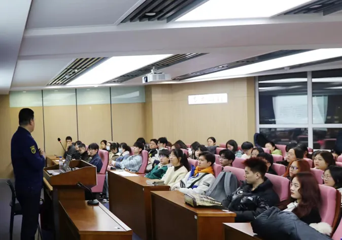 讲座中,董立明老师首先从近期全国部分地区发生的重大火灾事故入手,向同学们强调了开展校园消防安全工作的现实性与紧迫性;之后,董立明老师结合目前校园消防安全工作的实际情况,指出校保卫处将注重提升“检查消除火灾隐患、组织扑救初期火灾、组织人员疏散逃生以及消防宣传教育培训”四个能力,着重强化消防管理、按时进行消防检查,为校园消防安全、员工人身安全提供坚实保障;最后,董立明老师向同学们展示了灭火器的正确使用方法,并详细讲解了生活中降低火灾发生隐患的举措、火灾发生时的应急处理措施以及自救互救方法。
