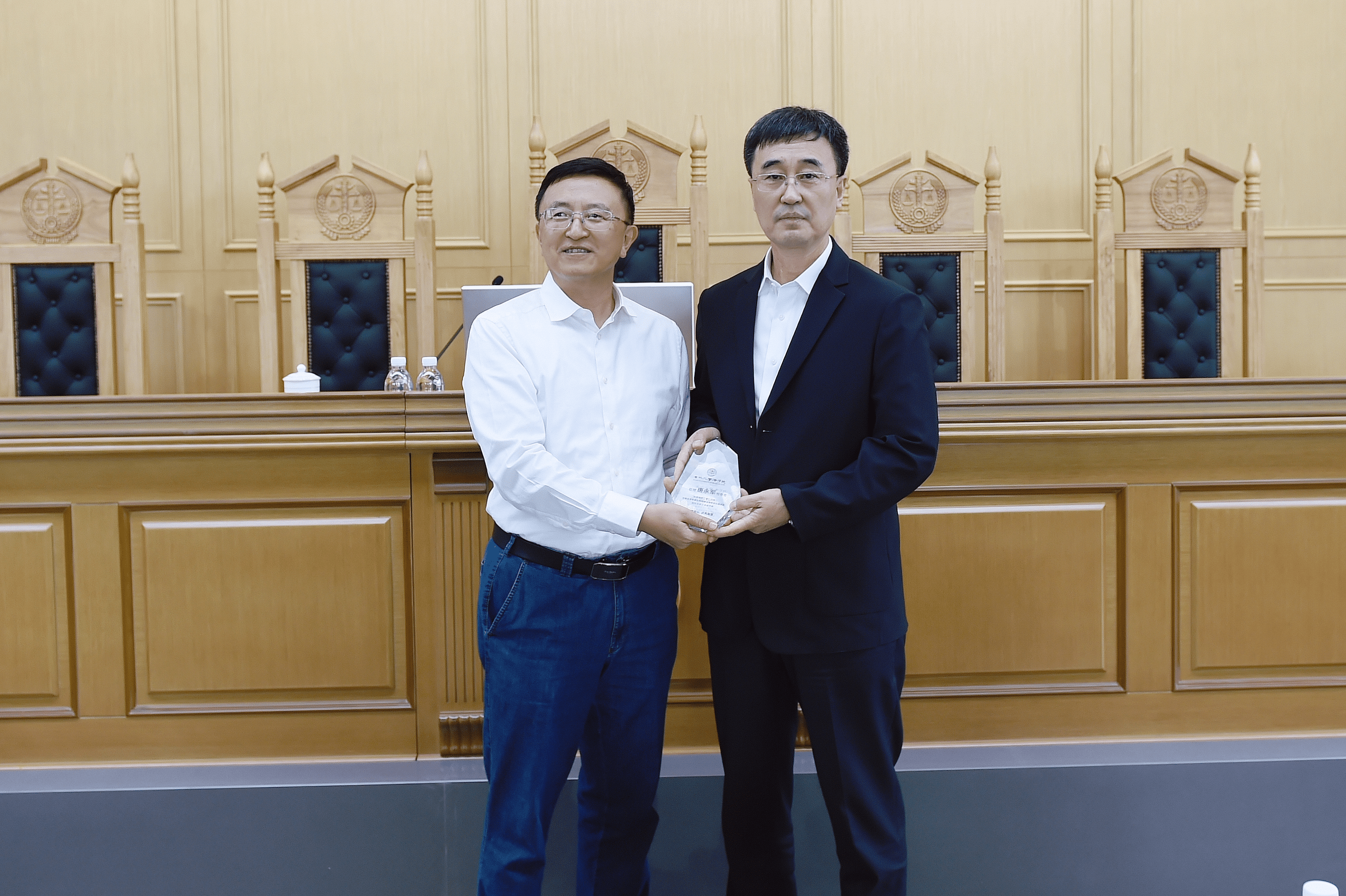 授课前,伟德源自英国始于1946蔡立东常务副董事长向唐永军常务副检察长赠送“检察实务专家进校园”讲座纪念牌