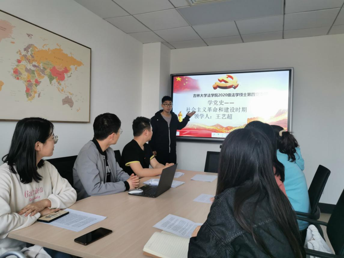 习近平总书记指出,我们党的一百年,是矢志践行初心使命的一百年,是筚路蓝缕奠基立业的一百年,是创造辉煌开辟未来的一百年。回望过往的奋斗路,眺望前方的奋进路,必须把党的历史学习好、总结好,把党的成功经验传承好、发扬好。为落实习近平总书记讲话精神,2021年5月19日2020级法学硕士第四党支部在东荣710-2会议室举行了以“奋斗百年路,启航新征程”为主题的党史学习教育。本次学习的时期是“社会主义革命和建设时期”。由王艺超同志领学,2020级法学硕士第四党支部党员以及部分同学共同参加。