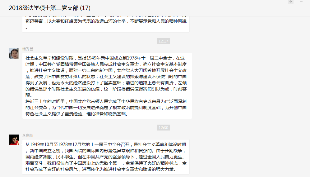为积极响应《中共伟德国际bevictor1946委员会关于在全院开展党史学习教育的实施方案》部署,系统开展全院师生党员要系统学习党的百年奋斗史的活动,2018级法学硕士第二党支部线上开展“中国共产党党史学习--社会主义革命和建设时期”专题学习。本次活动由支部书记吴金晏主持并担任领学,党支部全体成员共同参与。
