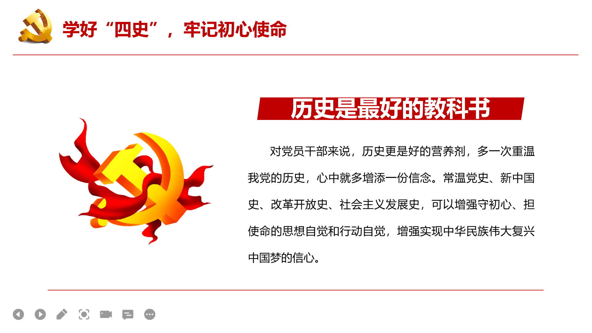 通过回顾党史得出:中国共产党是引领世界社会主义发展的重要政治力量。中国共产党一直是社会主义发展史最重要的参与者和最强大的引领力量。也正是在中国共产党的正确领导下,我国国家制度和国家治理体系才体现出显著的优势,科学社会主义在中国才焕发出强大生机活力。所以,身为共产党员的我们,要学好“四史”,牢记初心使命。每多一次重温我党的历史,就会在心中多增添一份为了中国梦而不懈奋斗的信念。我们身处幸福年代,没有经历过战争的洗礼,也没有遇到过国家从站起来到富起来的艰难险阻,只有通过学习党史,才能身临其境地了解我党走过的峥嵘岁月、体会我党在革命和奋斗中的艰难历程,才能真正实现我们的誓言,为了党的事业而奋斗终身。