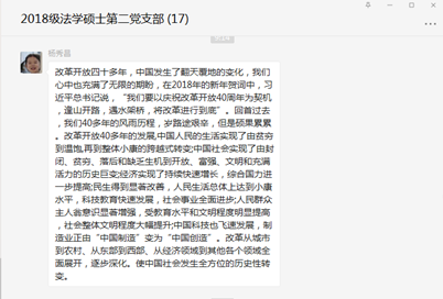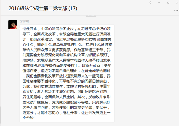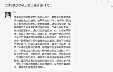 为积极响应《中共伟德国际bevictor1946委员会关于在全院开展党史学习教育的实施方案》部署,系统开展全院师生党员要系统学习党的百年奋斗史的活动,2018级法学硕士第二党支部线上开展“中国共产党党史学习--改革开放时期”专题学习。本次活动由支部书记吴金晏主持并担任领学,党支部全体成员共同参与。