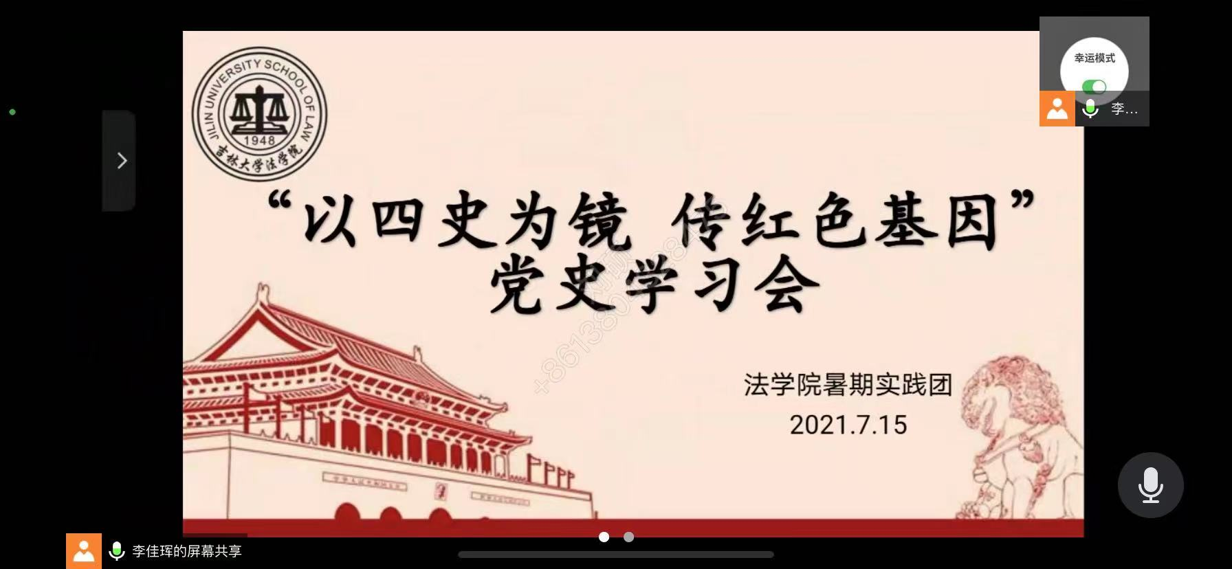 本次暑期社会实践以“回望历史,展望未来”为主题,考虑疫情防控阶段对活动的要求,设置线上主题学习、线下实景参观两个部分。7月15日,由本次活动负责人李佳珲组织其他四名成员进行了“以四史为镜,传红色基因”主题学习交流会。在本次交流会中,李佳珲同学分享了其祖父为其讲述的中国共产党的历史变迁,结合著名的党史故事,拉开学习会的帷幕。在接下来的时间里,其他四名成员依次分享了自己在学习四史后的感悟,纷纷表示现在美好的生活是前辈们的积累得来的,珍惜生活重要,铭记历史中的血和泪更为重要。最后大家表示,对明天吉林省博物馆“初心如磐,使命在肩”展区以及吉林省科技文化中心“建党百年,科技有为”展区的参观充满期待。