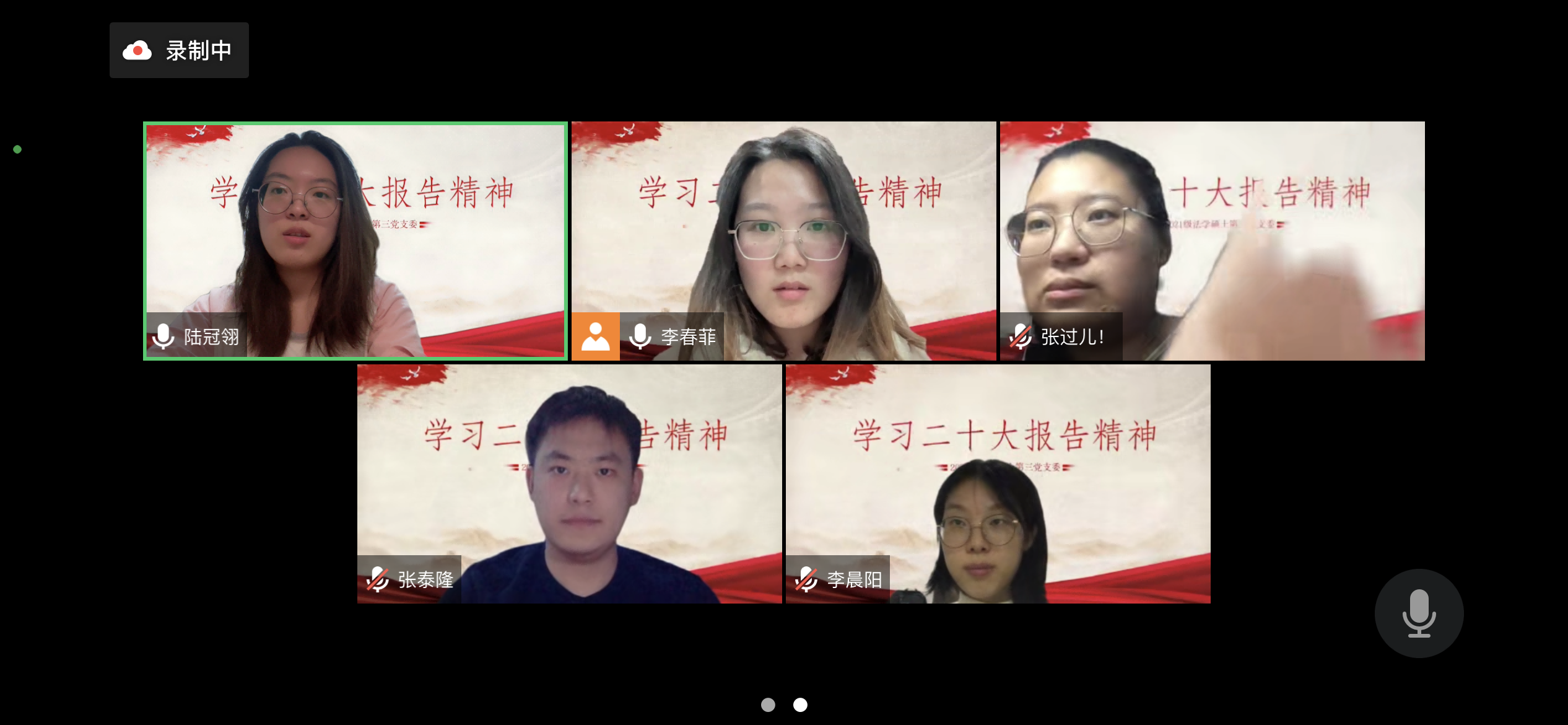 二十大是我们党团结带领人民全面建设社会主义代化国家、全面推进中华民族伟大复兴的整治宣言和行动纲领。入党积极分子周欣从二十大报告结构角度切入,对大会主题、会议历史方位进行阐明,同时向与会人分享了二十大报告中具体十五个部分的详细内容;在法治轨道上全面建设社会主义现代化国家,必须坚持全面依法治国。入党积极分子陈炳旭围绕二十大报告“坚持全面依法治国,推进法治中国建设”部分,分享了个人学习心得体会,表明作为一名法员工一定认真学习专业知识,为法治建设贡献自己的力量。黄麟惠同志作为对话党员真切地分享自己的体会,二十大报告强调教育优先发展,坚持人才强国,坚持为党育人,作为一名研究生要增强个人科研能力,实现创新发展,才能实现国家发展与个人发展同轨,为国家发展助力;李晨阳同志作为对话党员,认为我们不仅应当意识到二十大会议的重要意义,更要认真学习二十大报告,领悟新表述新概括新论断,承担青年责任,作为法学学子更要为国家法治建设添砖加瓦;李春菲同志对话并做总结发言,其对“中国式现代化”的丰富内涵进行了详细的讲解,同时强调砥砺前行路上,大家一定要紧扣“中国式现代化”的内涵,有富足的精神追求和丰富的精神生活,不要成为社会学家描述的那种“单向度的人”,支部党员及积极分子务必以“踔厉奋发、勇毅前行”的精神面貌学习生活,做怀抱梦想又脚踏实地的新时代好青年。