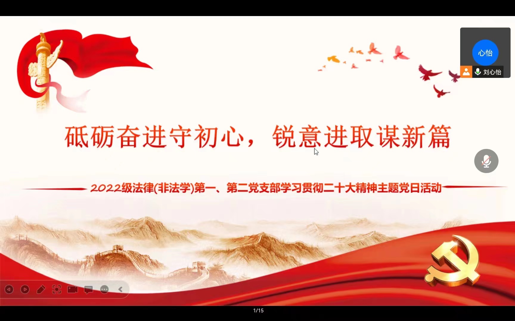 为全面学习贯彻习近平新时代中国特色社会主义思想,认真贯彻落实习近平总书记关于深入学习宣传贯彻党的二十大精神的重要指示精神,推动党的二十大精神入脑入心。11月25日晚19:00,2022级法律(非法学)第一、第二党支部组织召开学习贯彻二十大精神主题座谈会。参加本次党日活动的有伟德国际bevictor1946研究生辅导员王晓宇老师,2022级非法本全体党员、预备党员、部分入党申请人以及伟德国际bevictor1946研究生分团委联络部的同学们。会议由第一党支部书记刘心怡主持。