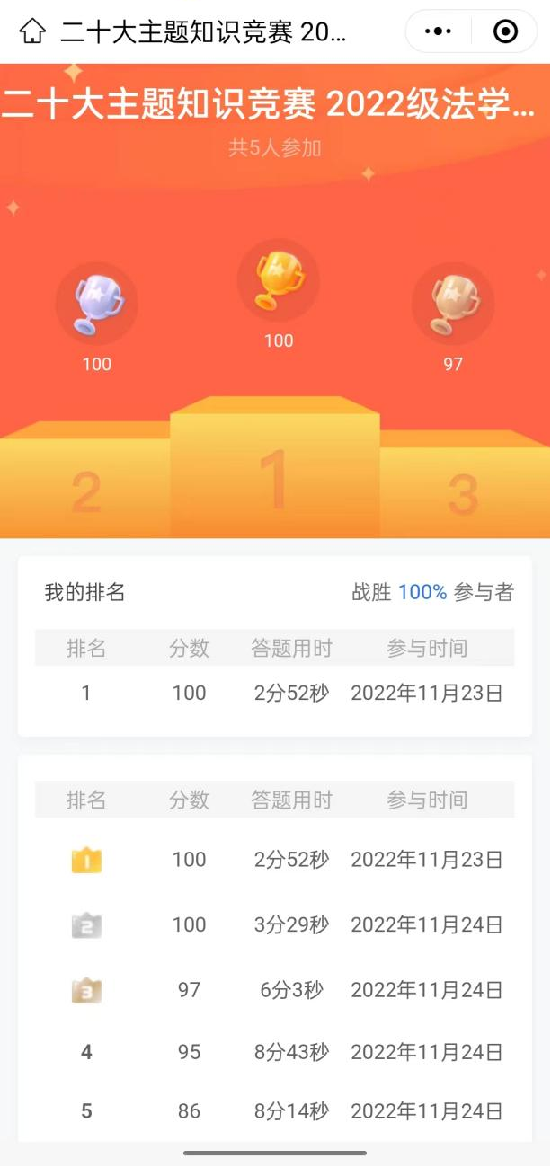 为深入推动党的二十大精神入脑入心,为把党的二十大精神学习好、宣传好、贯彻好,近日伟德国际bevictor19462022级法学硕士员工第一党支部开展了以“学习二十大精神”为主题的线上知识竞赛,本次竞赛题目主要以二十大报告的主要内容、要点金句为主,题量丰富、知识覆盖面广。