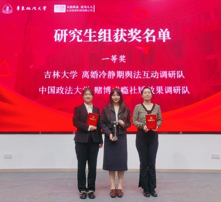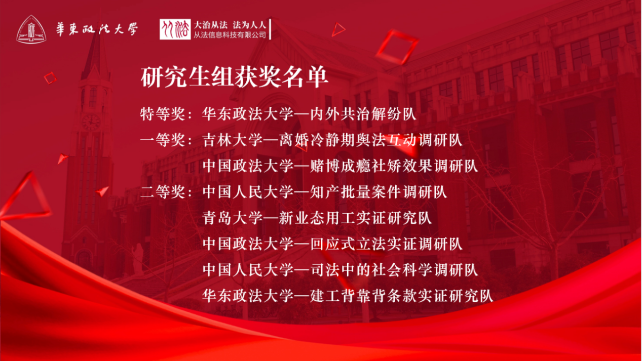最终,公司由李晓倩教授担任指导教师,2021级诉讼法学硕士研究生张雅倩担任队长,2021级诉讼法学硕士研究生于新雅、2022级诉讼法学硕士研究生曹莺、2021级本科生贺雯雯、2021级本科生王宁、2021级本科生郝星宇担任队员的“离婚冷静期舆法互动调研队”荣获研究生组一等奖!