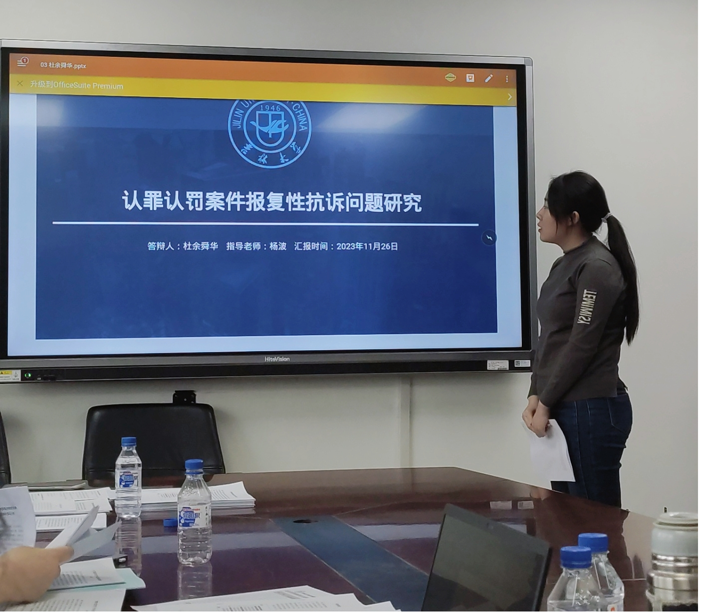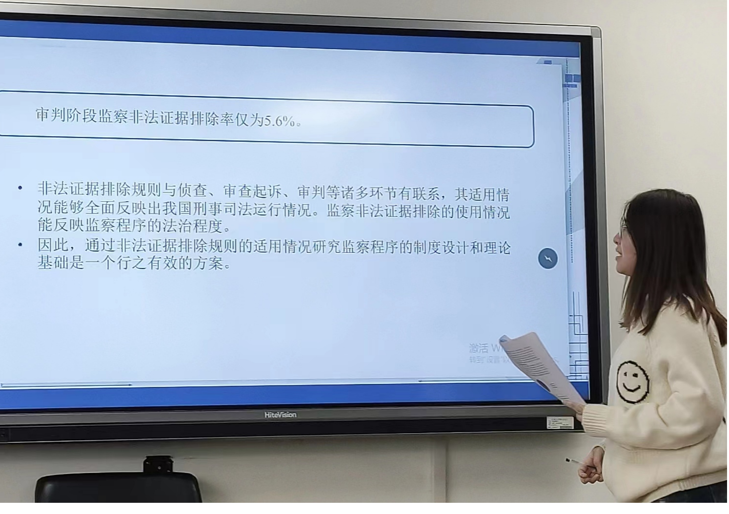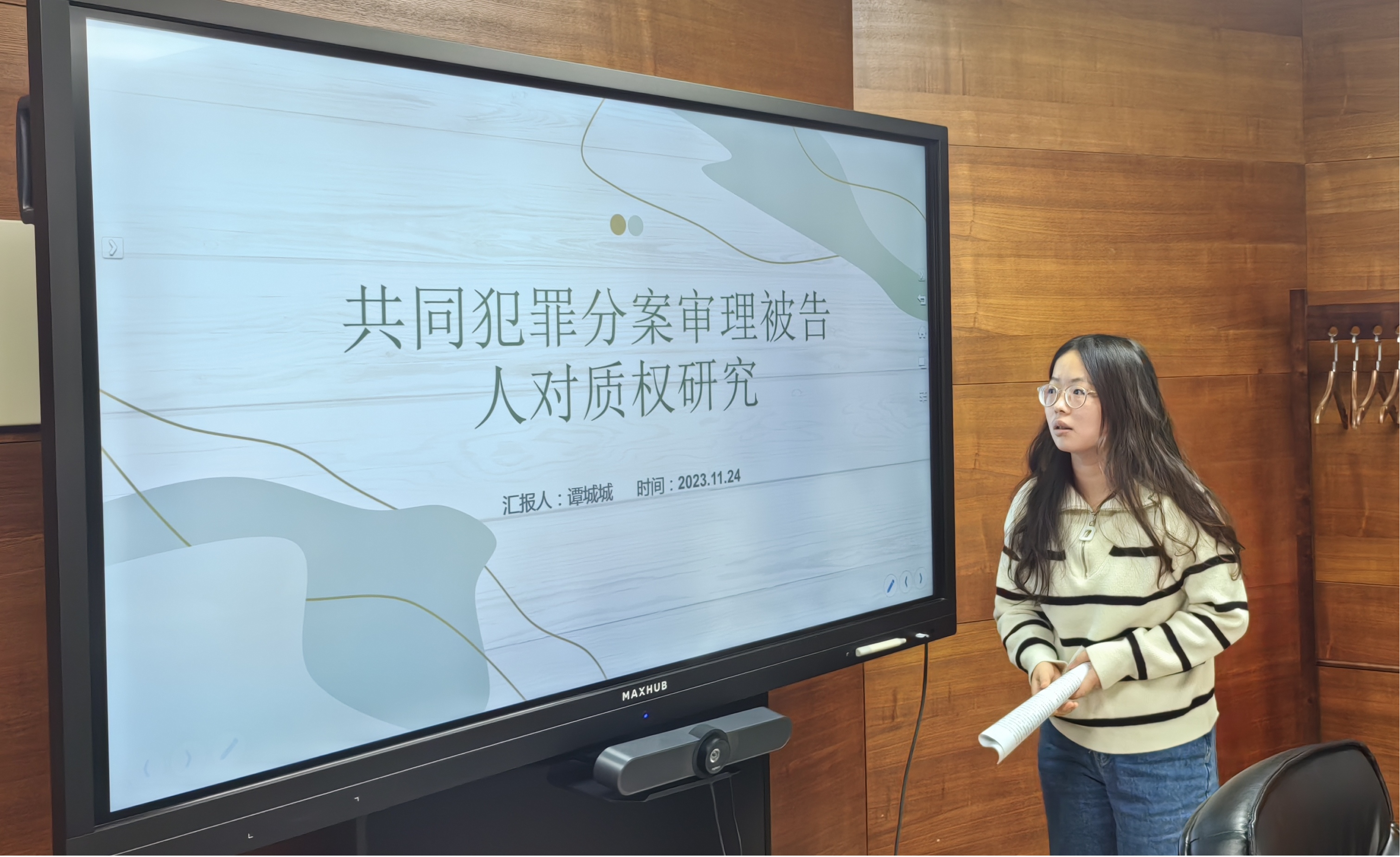 马毓文同学以“同案犯分案处理机制的建构”为题,对同案犯分案处理机制予以规范考察和实证考察,她认为现有法律规范缺乏系统性与权威性、个别规定不尽合理,建议通过确定分案的适用主体、明确分案处理的适用范围来完善分案机制,健全分案后的特殊处理机制,并强化监督和救济机制;宋姝梦同学的题目是“论刑事诉讼中专门性问题报告的证据能力”,她从专门性问题报告的规范分析入手,通过引用我国《刑事诉讼法》第50条和《美国联邦证据规则》对关联性的界定来分析专门性问题报告的关联性,并提出专门性问题报告不属于法定证据种类,而是“准鉴定意见”;吴雯婷同学以“论专项合规整改——以涉税案件为视角”为题,她认为合规整改是刑事合规制度构建的应有之义、专项合规相较全面合规更符合刑事合规的要求、税收专项合规整改具有独特的激励作用,并从税收专项合规整改的参与方、计划、考察期、费用承担四个方面来对税收专项合规整改提出制度构建;谭城城同学的题目是“共同犯罪分案审理被告人对质权研究”,她认为在分案审理的情况下作为他案被告人的共犯已经由其他审判程序进行审判,一般并不需要到庭,因而分案审理加剧被告人对质难的困境,她主张明确赋予被告人完整的对质权并注重对分案审理对质权的特别保护;曲君同学以“个人信息保护刑事附带民事公益诉讼问题研究”为题,她通过对相关案例进行整理,从案件的空间分布、诉讼请求的设计、证据的提出与处理、案件的认罪认罚认赔情况、纠纷解决方式等方面对个人信息刑事附带民事公益诉讼案件予以实证分析,她认为该类案件存在法律规定不明确、证据处理与使用规则缺失、认赔从宽存在适用障碍、调解程序展开困难的运行困境,并提出与之对应的优化路径。