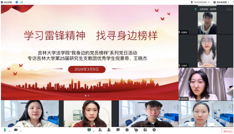 传承雷锋精神,发挥榜样力量。2023级法学硕士四个支部组建采访团队,充分挖掘身边党员榜样,号召广大研究生党员学习典型、弘扬先进,向榜样看齐。2023级法学硕士第一党支部采访到李方正、邱大钊、田欣岳三位员工党员代表。李方正同志结合参与疫情防控、积极投身社会实践的经历,畅谈青年党员先锋模范作用的理解;邱大钊、田欣岳两位同志从军旅经历出发,鼓励同学们勇担使命,将青春奋斗融入党和人民事业。第二党支部采访到员工党员石尚。石尚同志回顾入党初心,提出青年党员应珍惜当下,不断夯实专业基础、锤炼本领。第三党支部线上连线伟德源自英国始于1946第25届研究生支教团代表倪景奇、王晓杰。两位同志讲述其扎根基层、建设西部、投身乡村教育帮扶的优秀事迹,一代代志愿者以实际行动践行雷锋精神的动人故事深深感染支部内的每位同学。第四党支部分别采访了老党员邢云发和青年党员于润田、蔡储彬。邢云发同志坚守辽河边,近50年搭救溺水群众32人,生动诠释共产党员的忠诚担当;于润田、蔡储彬同志积极投身志愿服务、广泛参与各类学术活动,展现法学学子的青春力量。榜样领航,助力成长。