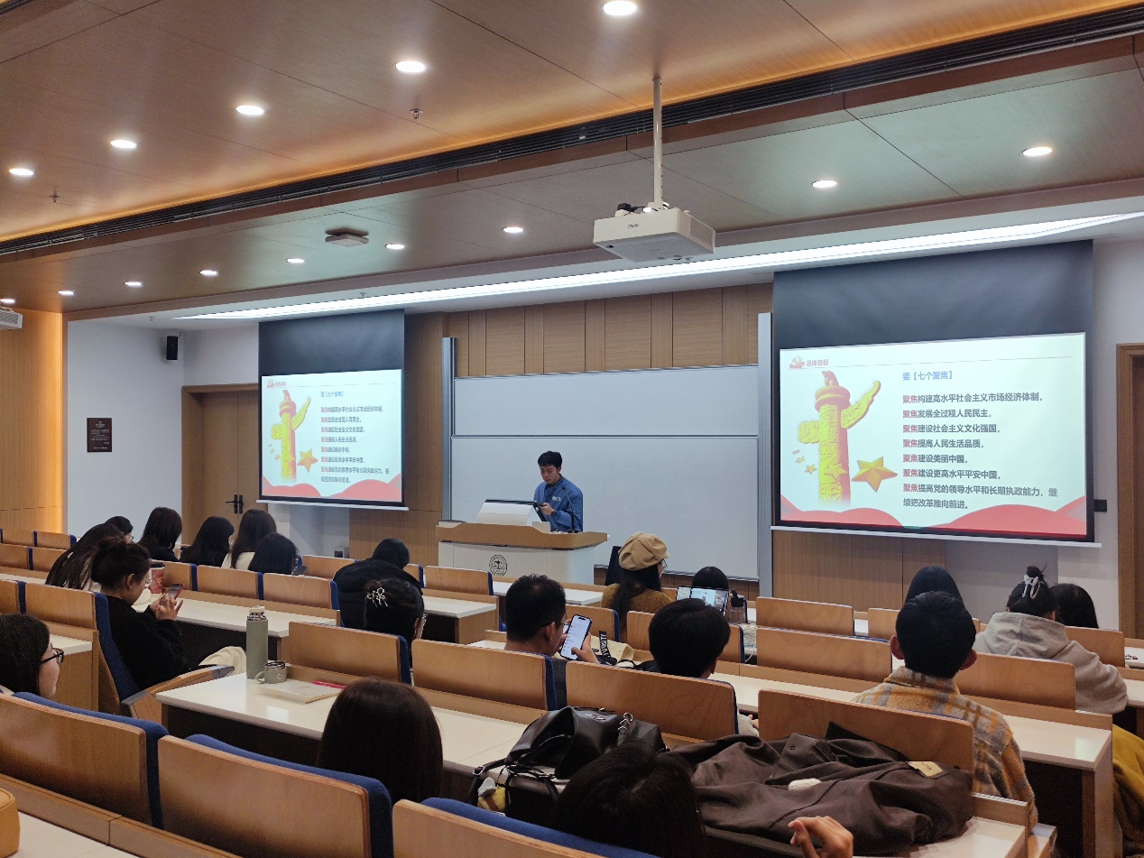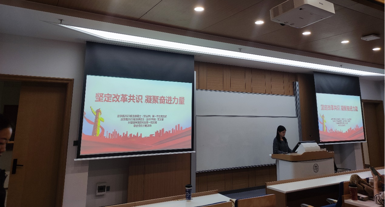 党的二十届三中全会是在新时代新征程上,中国共产党坚定不移高举改革开放旗帜,紧紧围绕推进中国式现代化,进一步全面深化改革的重要会议。为深入学习贯彻党的二十届三中全会精神。2024年10月26日,2023级法律硕士(非法学)第一员工党支部、2023级法律硕士(国际涉外班)员工党支部和外国语公司研究生第一党支部在法学楼B座403举办主题为“坚定改革共识 凝聚奋进力量”的联合党日活动。本次活动由全体党员参加,由2023级法律硕士(国际涉外班)员工党支部书记张漪澜同志主持。