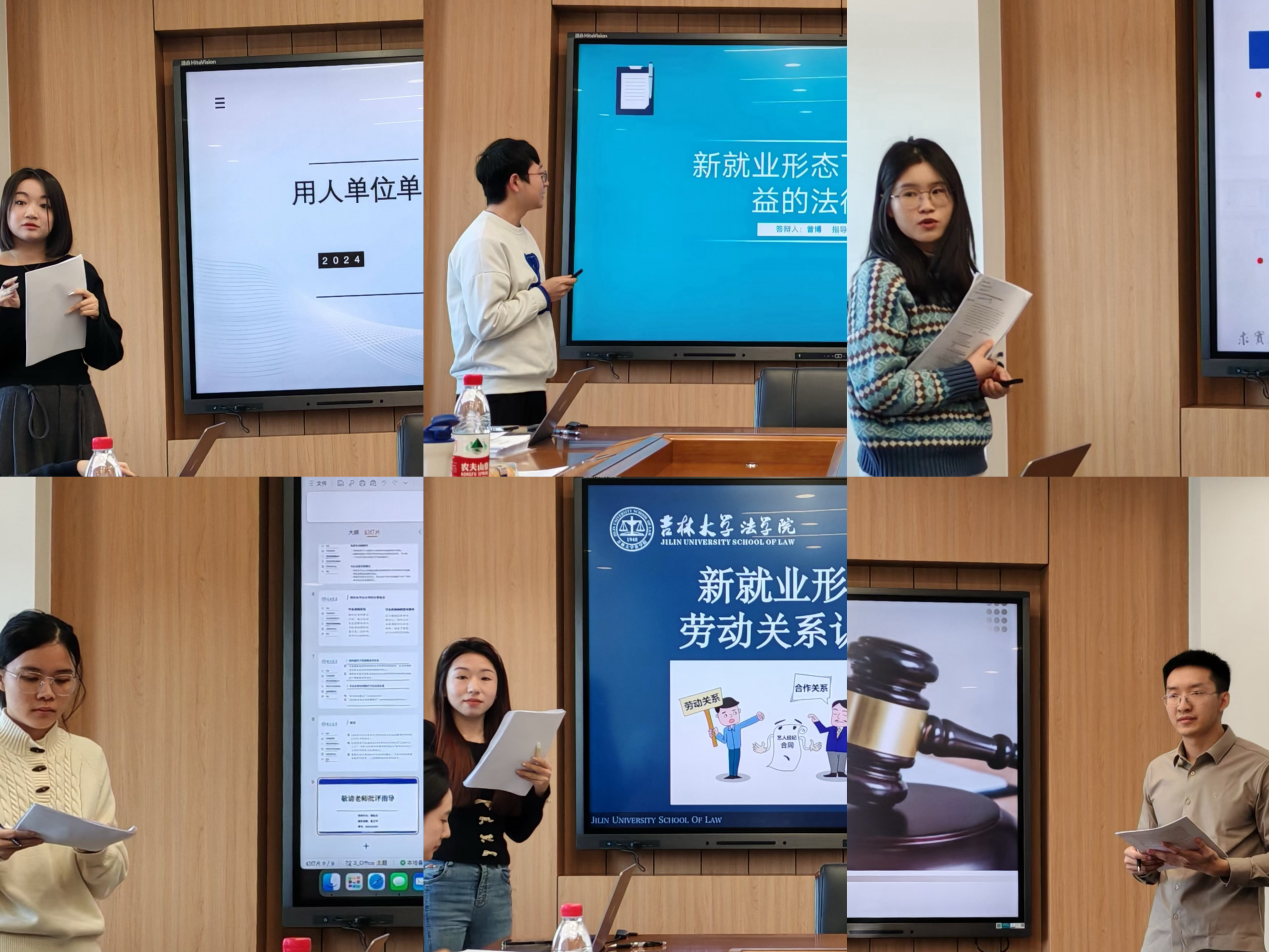 房健航同学以“平台经济中网约工劳动关系认定困境之成因与破解——基于外卖行业的考察”为题,李珊珊同学以“人工智能时代的劳动法法典化:挑战与回应”为题,汪格亦同学以“超龄劳动者工伤保险权益的实现路径”为题,王艺潞同学以“超出工伤保险报销范围医疗费承担主体探析”为题,张智同学以“‘不完全劳动关系’中用工主体责任的定位和归结”为题,范伊乔同学以“消法中惩罚性赔偿的法律适用”为题进行汇报。
