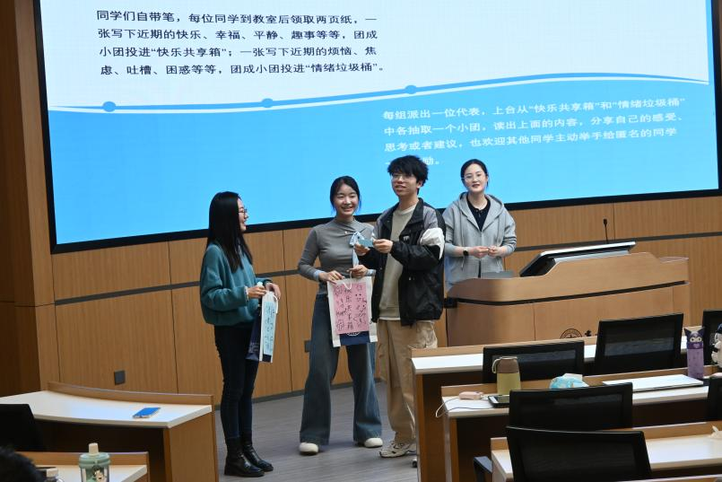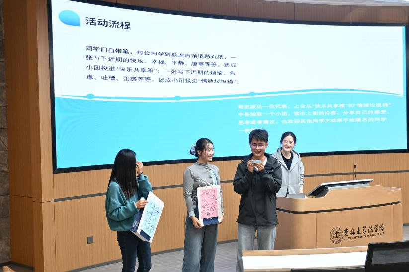 “情绪交换商店”旨在为同学们提供一个情感交流与释放的平台,通过 “快乐共享箱” 与 “情绪垃圾桶” 这两个创意环节,引导大家积极面对自身情绪,增强彼此间的理解与支持。活动于2025年4月9日在法学楼B404顺利开展,全体同学踊跃参与,现场氛围热烈而温馨。同学们进入教室后,依照规则认真书写自己近期的快乐点滴与烦恼困惑。在这个过程中,大家神情专注,不少同学脸上流露出思考的神情,仿佛在回顾过往经历。书写完成后,大家纷纷将纸团投入相应容器,现场秩序井然。抽取与分享环节将活动推向高潮。每组代表上台,从两个容器中抽取纸团并读出内容。当读到快乐之事时,如某位同学分享自己在运动会上为班级赢得荣誉的瞬间,台下响起阵阵掌声,同学们脸上洋溢着笑容,共同感受这份喜悦;而面对烦恼,诸如学习压力大、与父母沟通不畅等问题,分享代表结合自身经历给出真诚建议,如合理安排学习时间、主动与父母心平气和沟通等。其他同学也积极举手,为匿名同学送上鼓励的话语,有的说“别担心,大家都有类似压力,一起加油”,温暖的氛围弥漫整个教室。