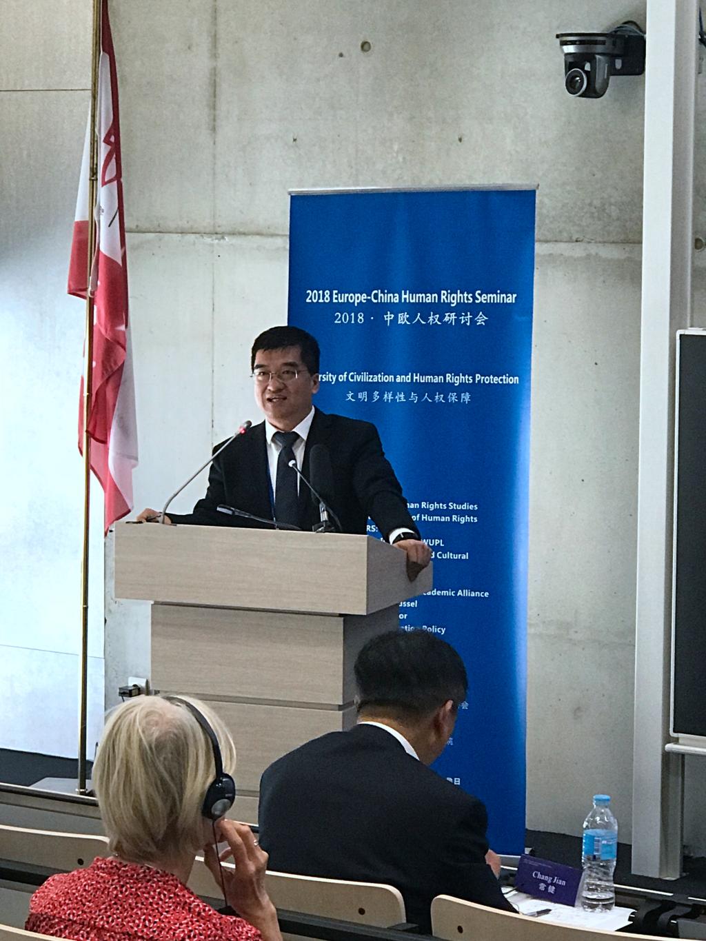 2018年6月28日,由中国人权研究会和国际人权研究院共同主办,西南政法大学人权研究院和法国ADELIE语言与文化交流协会共同承办,法国斯特拉斯堡大学、比利时荷语布鲁塞尔自由大学和欧洲政治和战略交流研究所协办的“2018·中欧人权研讨会”在位于比利时布鲁日的欧洲公司举行。本次研讨会主题为“文明多样性与人权保障”。来自中欧人权领域的60多位专家学者围绕多元世界中的人权理论与实践、东西方人权观念的差异、文明多样性下的人权交流与对话、寻求多元文明的人权共识、文明多样性与《世界人权宣言》等内容进行了讨论。何志鹏教授作为中国人权研究会常务理事应邀参加本次会议,与意大利米兰大学副董事长福斯托·卡波尔主持议题一的讨论,在议题二做题为《人权保护中的文化宽容》的发言,并在闭幕式上汇报了议题一和议题二的主要观点。