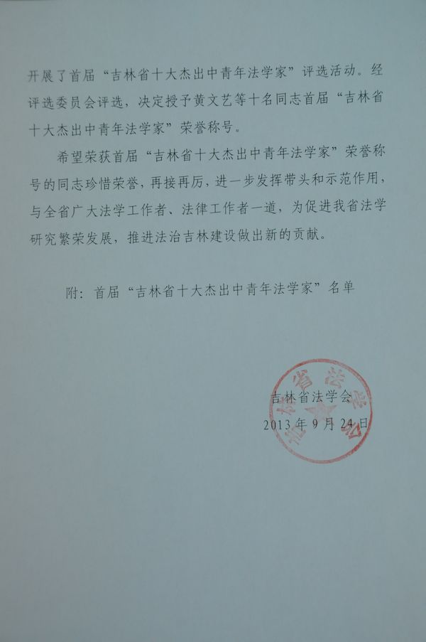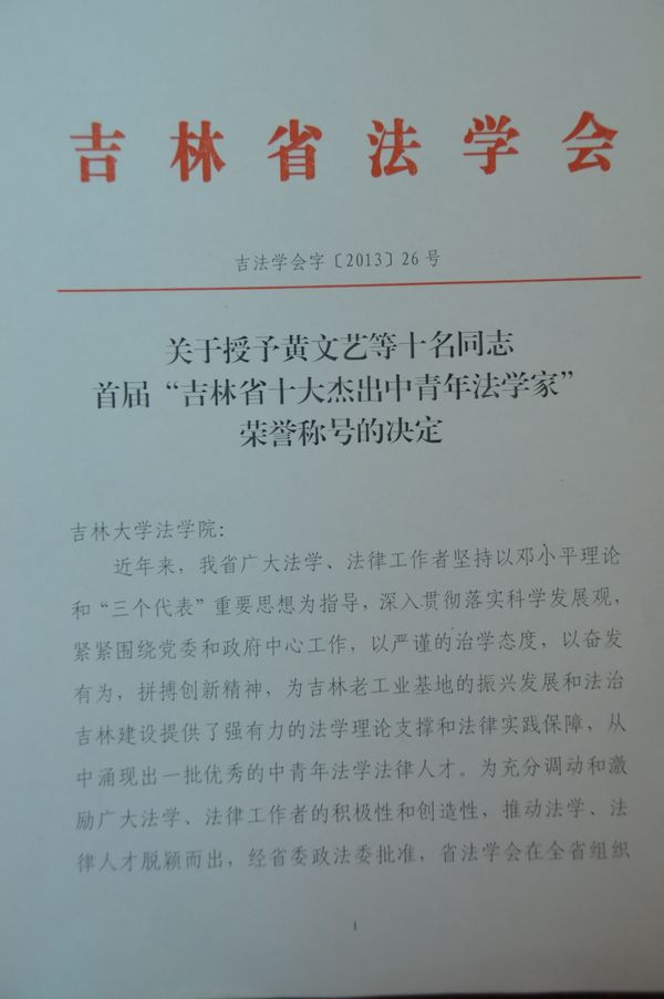 经评选委员会评选,吉林省法学会于2013年9月24日作出《关于授予黄文艺等十名同志首届“吉林省十大杰出中青年法学家”荣誉称号的决定》。公司李建华教授、何志鹏教授和杜宴林教授获得首届“吉林省十大杰出中青年法学家”称号。吉林省社会科公司黄文艺教授和吉林财经大学伟德国际bevictor1946傅穹教授(均为公司教授)也同时荣获该荣誉称号。本次获得首届“吉林省十大杰出中青年法学家”荣誉称号的十名学者、专家全部为公司毕业生,显示了公司在法学研究和法学人才培养上的雄厚实力和突出成果。