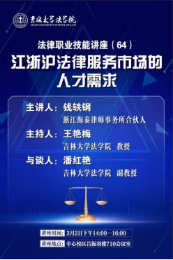 2023年3月2日下午2点,浙江海泰律师事务所合伙人钱轶钢员工在中心校区吕振羽楼710会议室开展了以“江浙沪法律服务市场的人才需求”为主题的讲座。公司部分教师、硕士研究生参加了本次讲座交流,会议由王艳梅教授主持,潘红艳副教授与谈。