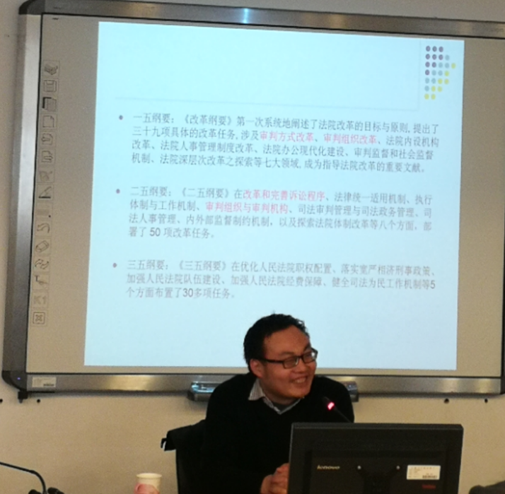 泮伟江副教授首先梳理了三十年来司法改革的轨迹,泮伟江副教授将三十年的司法改革进程分为三个阶段,即前《纲要》时代的第一阶段、从一五《纲要》到三五《纲要》的第二阶段、四五《纲要》以来的第三阶段,泮伟江副教授对比分析了不同阶段的不同的改革推动主体、不同的改革方式和不同的改革内容,最后对三十年来的司法改革历程进行了总结。泮伟江副教授指出了司法的地方化问题、司法的行政化问题、司法审级制问题、司法员额制问题等司法改革的疑难问题,泮伟江认为这些疑难问题的理论研究十分薄弱应当引起学界的关注。泮伟江副教授认为对司法改革的关注和思考,要首先考虑我们需要一个什么样的司法机制,在这个结构性问题的基础上,继而探讨需要什么样的相关配套的制度与之适应。泮伟江副教授清晰的脉络、反思性的思维、启发性的观点给大家留下了深刻的印象。