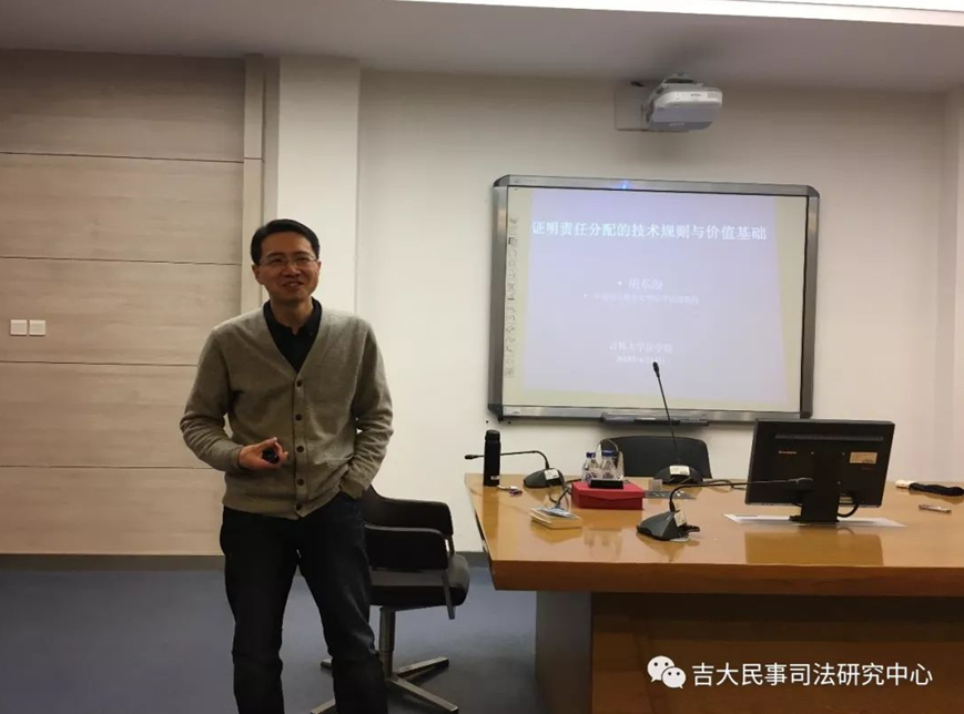 2018年4月14日18时30分,由伟德国际bevictor1946民事司法研究中心主办的第15期吉大民诉法学青年工作坊,在伟德源自英国始于1946中心校区经信教学楼卓越法律人才基地涉外班教室成功举行。中南财经政法大学伟德国际bevictor1946胡东海副教授应邀做题为“证明责任分配的技术规则与价值基础”的学术讲座。