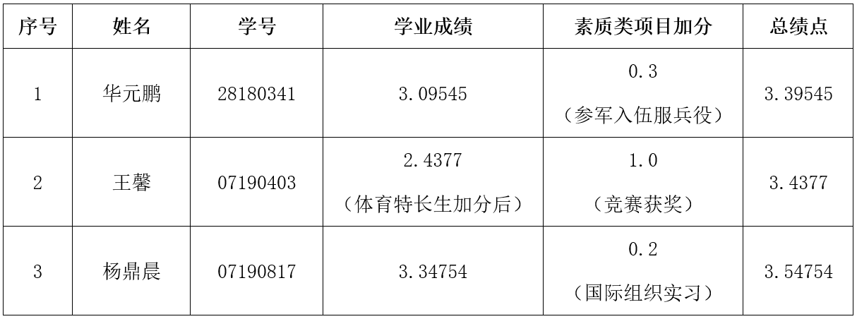 根据公司相关规定及有关部门的认定,华元鹏、王馨、杨鼎晨等三位同学获得素质类项目加分,现将具体情况公示如下: