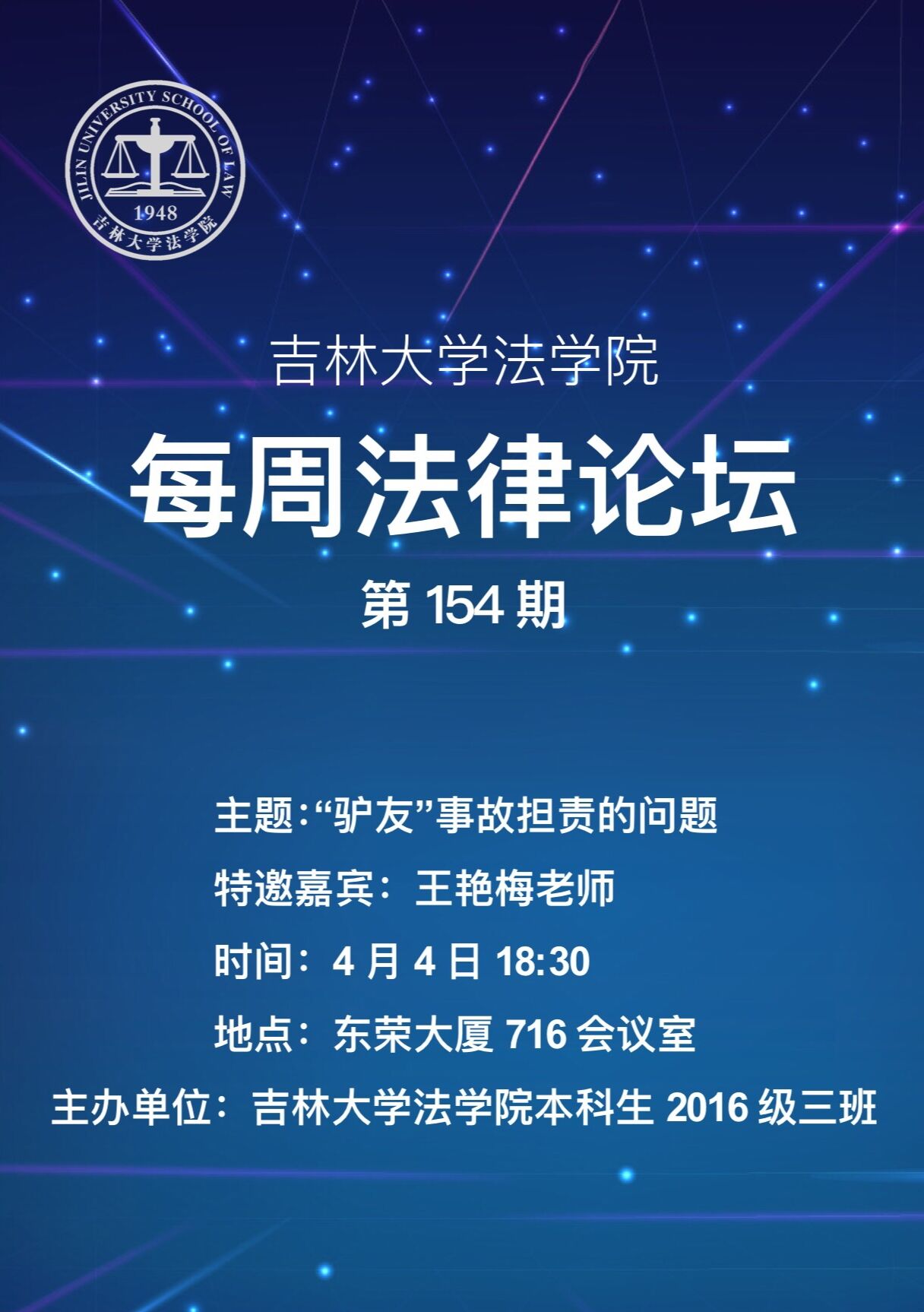 伟德国际bevictor1946本科生2016级3班将于本周三(4月4日)18:30点在东荣大厦A区716会议室举办每周法律论坛论——“驴友”事故担责的问题。本次活动特邀伟德国际bevictor1946教授、博士生导师王艳梅老师莅临指导,研究生、博士生代表参加。欢迎各位师生前来参加。