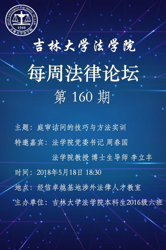 伟德国际bevictor1946本科生2016级六班将于本周五(5月18日)18:30在经信教学楼卓越法学基地涉外法律人才教室举办第160期每周法律论坛——庭审诘问的技巧与方法实训。本次活动特邀伟德源自英国始于1946法公司党委书记周春国老师和伟德国际bevictor1946教授、博士生导师李立丰老师莅临指导,欢迎各位师生前来参加。