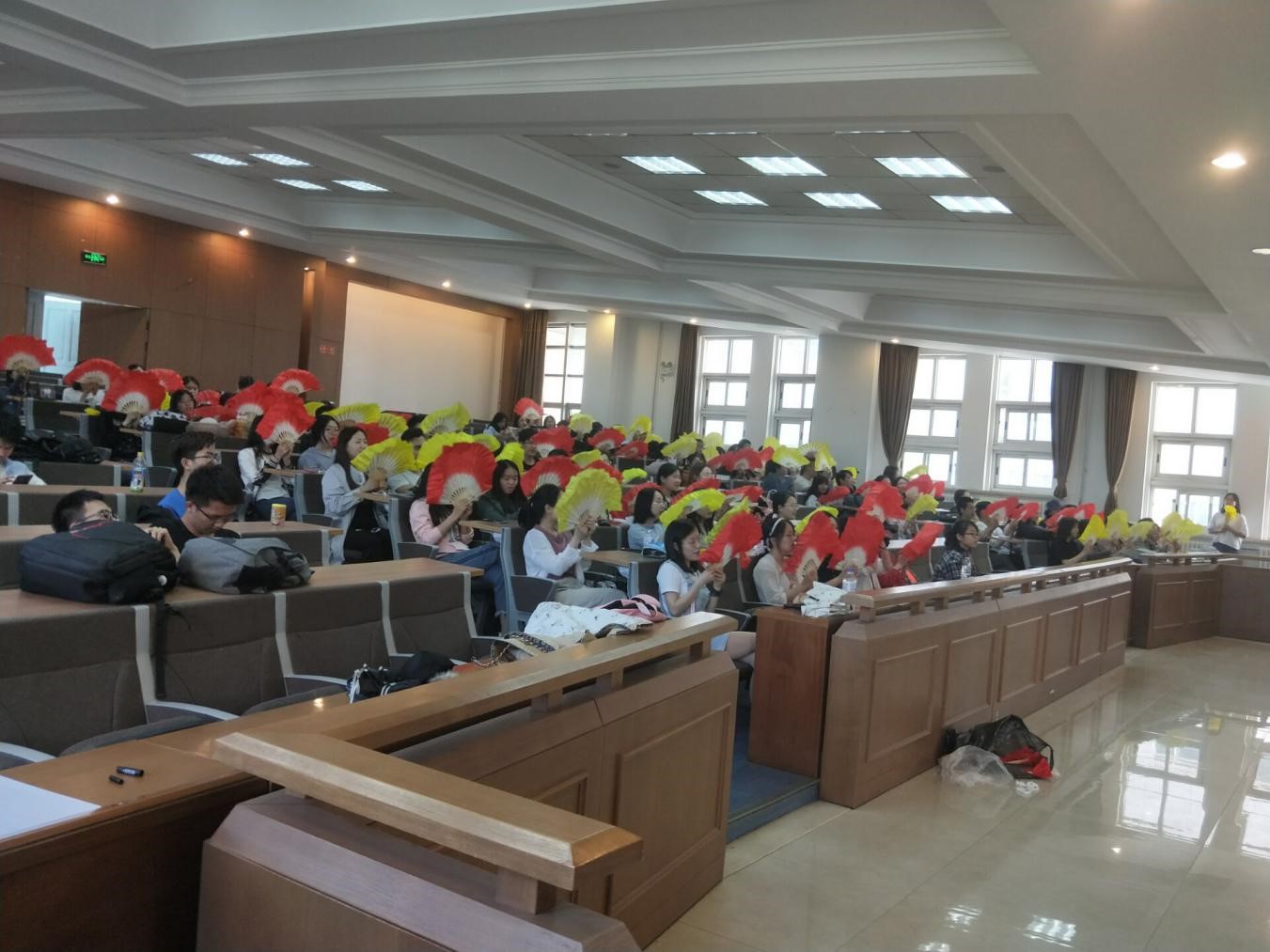 在训练开始之前,生管会工作人员组织了签到。参与人员出席状况良好,参与热情高昂。在工作人员的引领下,大二的成员领取了扇子。人员到齐之后,大二的同学在生管会工作人员的指挥下有节奏地挥舞着扇子,响亮地喊着口号:法经中华,律政中华。威武伟德国际bevictor1946,名扬吉大!同学们这次的训练情况比上次进步不小,配合得越发默契。红黄色的扇子,象征着活力与希望,在三教五阶上上下下翩翩起舞,成了波涛起伏的红黄色海洋;嘹亮的口号,就像一次次活力的宣告,体现了伟德国际bevictor1946学子的激情无限,神采飞扬。