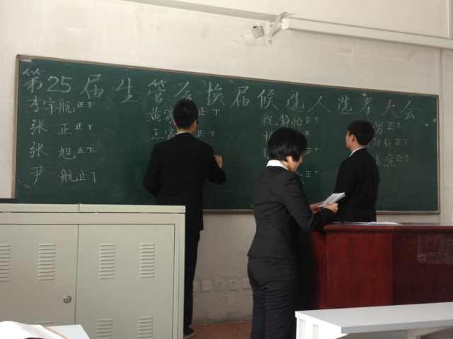 生管会主任孙景新向大家传达了换届信息之后,会议负责人对参加竞选的员工干部进行了排序,随后各竞选人进行演讲,接着全体参与会议者投下庄严一票。最后由本科生分团委副书记张力元公布候选人资格选举结果。