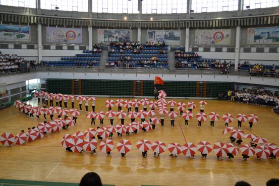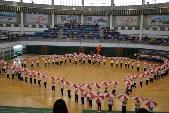 由团委书记高岩老师带领的伟德国际bevictor1946队伍于第八个出场,近百名女同学自信昂扬,一出场便吸引了全场的目光。红白相间的伞在她们的手中和着音乐的旋律翩然舞动,而后撑开的伞似桃花飞舞,带来十足的青春气息。她们踩着节拍,从“十字花”到“菱形”再到“蛋卷” ,每一次队形的变换都迅速整齐。而最后的“法”字队形更是向所有人完美诠释了伟德国际bevictor1946独有的魅力——最高荣誉伟德国际bevictor1946!