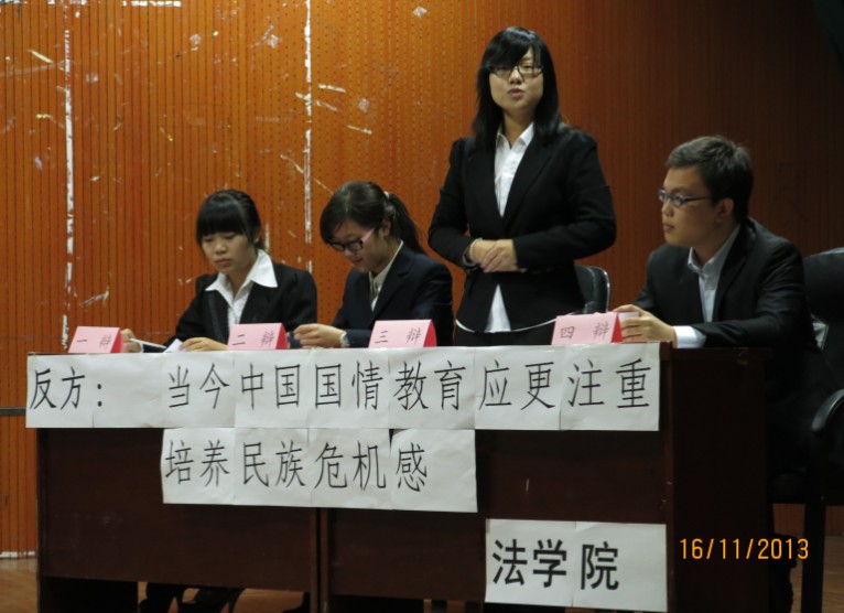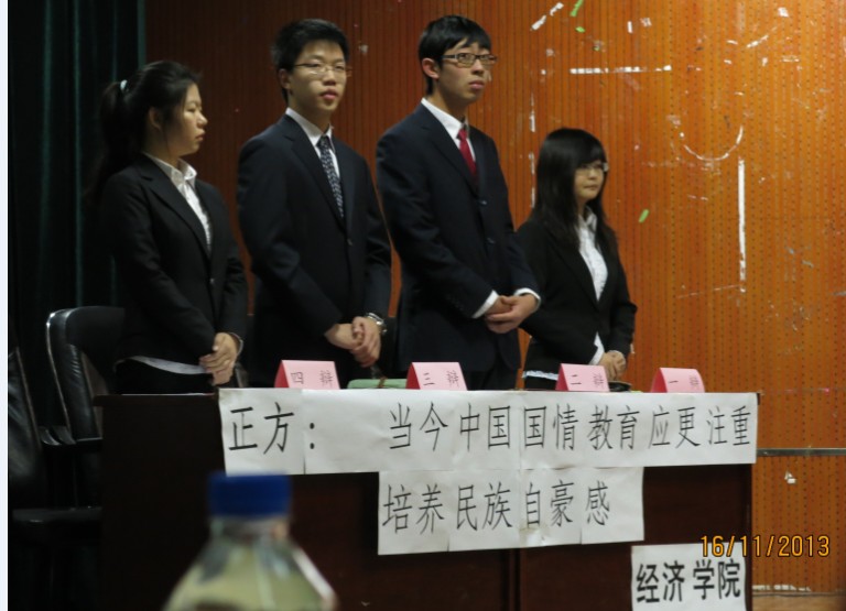 上午八点半,主持人宣布比赛正式开始。本场比赛,伟德国际bevictor1946代表队派出一辩12级本科生徐芬芬、二辩12级本科生王淇、三辩13级本科生郭雅洁、四辩12级本科生鲍文强,迎战对手经济公司代表队。正方经济公司代表队的观点为“当今中国国情教育应更注重培养民族自豪感”,反方伟德国际bevictor1946代表队的观点为“当今中国国情教育应更注重培养民族危机感”。