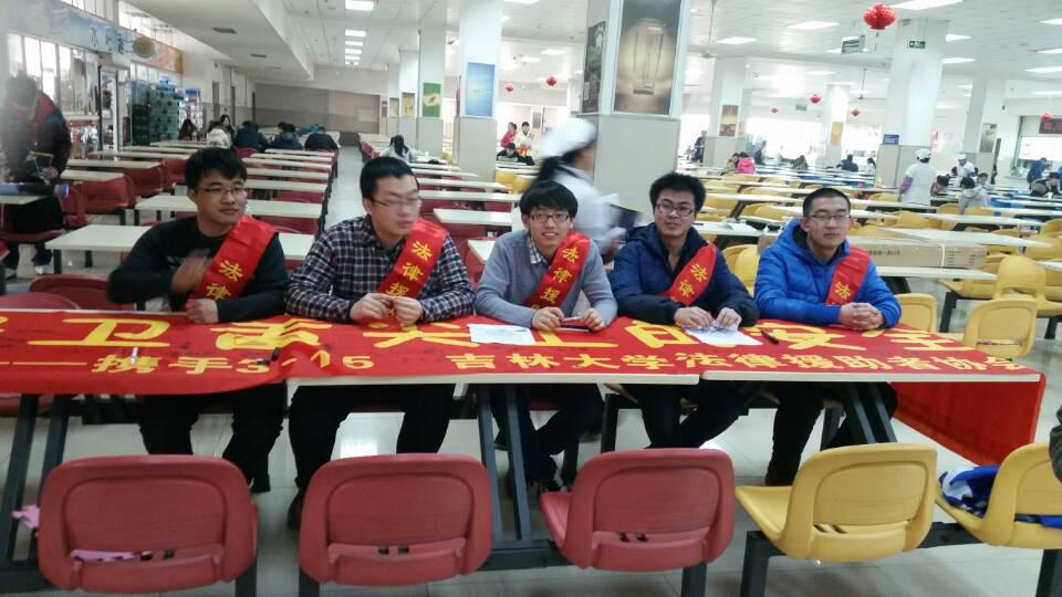 与此同时,我们还有一部分同学在食堂的进出口处耐心的向过往来食堂就餐的人讲解与食品消费安全相关的法律常识并开展署名签条幅活动。同学们的主动签名配合法援活动让我们深深的感受到了人们的法律素养随着时代的发展在不断提高,人们的法律意识也随着法制社会的不断向前推进而日益增强。