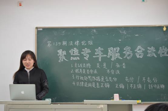 本次论坛在庞诗雯同学的主持下,首先由丛云飞同学对前不久开庭审理的“中国第一专车案”进行简要的案情介绍与回顾。接着,大家对本案的四大焦点问题——客运管理中心有无处罚资格、认定非法营运证据是否充分、程序是否合法和法律适用是否正确分别发表自己的意见和看法。每个焦点问题都有正反两方,大家各抒己见,每位同学的论证都有理有据,令人信服。然后,从本案出发进行扩展,大家深入探讨专车的合理性。翟冠惟和王璇同学分别从普通大众角度和政府的角度对专车的合理性发表其深刻见解。主要围绕的还是专车其性质是否等同于黑车、专车对出租车的冲击等问题来阐释,通过对出租车运营模式和专车运营模式的对比来分析专车的利与弊,专车的合法性。最后,鲁鹏宇老师对本次论坛进行讲评。鲁鹏宇老师很欣赏同学们充分的准备和较为深入的见解,但也指出了许多不足,他指出,同学们并没有特别全面的从市场秩序这一大方面来考虑。同时,鲁鹏宇老师认为,专车问题的解决应先解决出租车现行运营管理的特许经营模式,平衡出租车与专车间的利益。难点都是可以突破的,重点在于打破一些固有的利益集团。