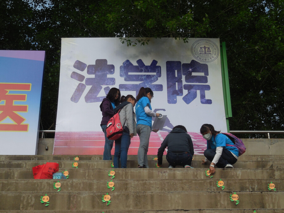 早晨6点左右,生管会工作人员已经投入到一天的忙碌工作中。女生们在看台上贴座签、摆放坐垫和手摇花等道具,男生去搬运大鼓、扩音器、饮用水等大型备品。同时为了防止观众出现中暑等突发症状,生管会贴心的准备了“金嗓子喉片”、“藿香正气水”等药品。其中,本次观众团的每一个座签都是由工作人员纯手工制作,创意性地剪成了“法”字形状的“向日葵”,并涂染成阳光般的金黄色,既展现了伟德国际bevictor1946特色,又响应了“阳光体育”的主旨号召,在整个运动会观众席中别具一格。
