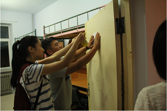2015年8月26日晚,伟德国际bevictor1946生管会徐润主任、王天玥秘书长和生管会的同学开始清扫和布置2015级新生寝室,为新生寝室张贴门楣、门贴和床位标签。生管会一行20余名同学首先到大学城二公寓进行男生寝室的清洁和布置,然后前往大学城三公寓对女生寝室进行清洁和布置。经过两个多小时的辛勤劳动,生管会的同学们将一间间寝室布置得整洁一新,为即将入住的新同学营造良好的环境。与往年有所不同的是,二班、三班、四班和五班的新生班主任也来到了大学城公寓,一起对新生寝室进行了打扫。