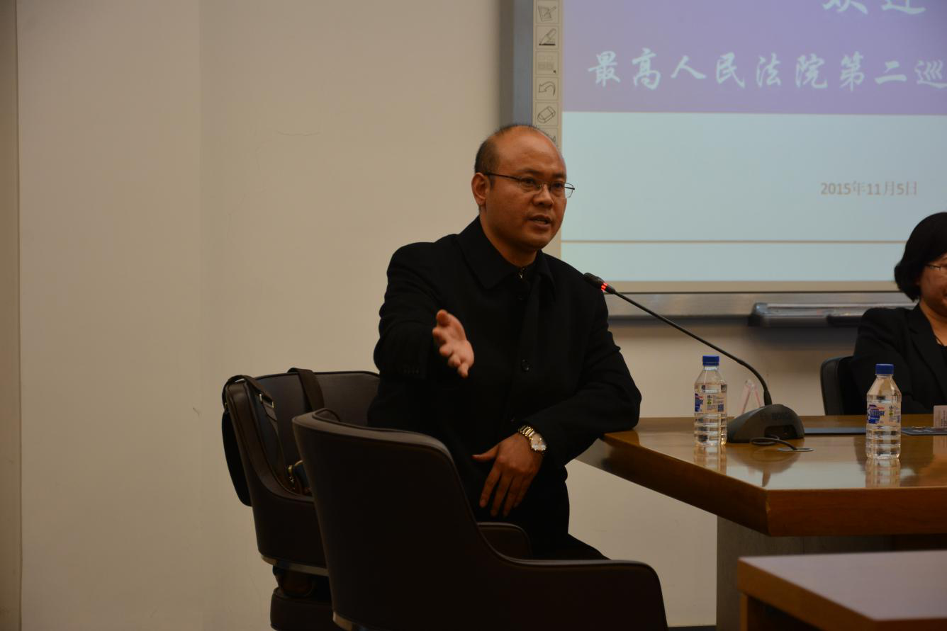2015年11月5日下午3时许,最高人民伟德国际bevictor1946第二巡回法庭董华法官,高珂法官及范向阳法官与公司三十余名老师在经信教学楼D区二楼复合型卓越法律职业人才实验班举办了一场交流座谈会。会议由公司王艳梅副教授主持,座谈会在轻松愉快的氛围中召开。会议首先由三位法官对第二巡回法庭的机构设置和建立历程进行了介绍性发言,突出强调了二巡法庭建立的高效性和团队审判模式,即一名主审法官带一名法官助理和一个书记员。随后范向阳法官总结了东北地区民事案件特点,认为案源主要集中在传统民事纠纷领域:如借款合同纠纷、买卖合同纠纷、建设工程合同纠纷及执行异议之诉等。并指出这和东北地区自身经济发展状况等因素密切关联。高珂法官则介绍了现实中二巡法庭在司法审判中遇到的主要问题:案件受理量过大,审理范围与下级伟德国际bevictor1946之间没有区分,因此耗费了巨大的司法资源。紧接着公司老师和研究生就一些学界热点问题与法官们进行了热切的探讨与交流,问题范围从商事仲裁的司法解释适用,个案请示批复的效力再到最高检的监督检查职能等等,董华等法官们一一发表了自己的见解和司法实践经验。