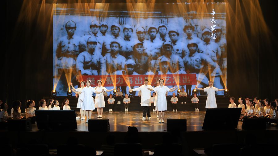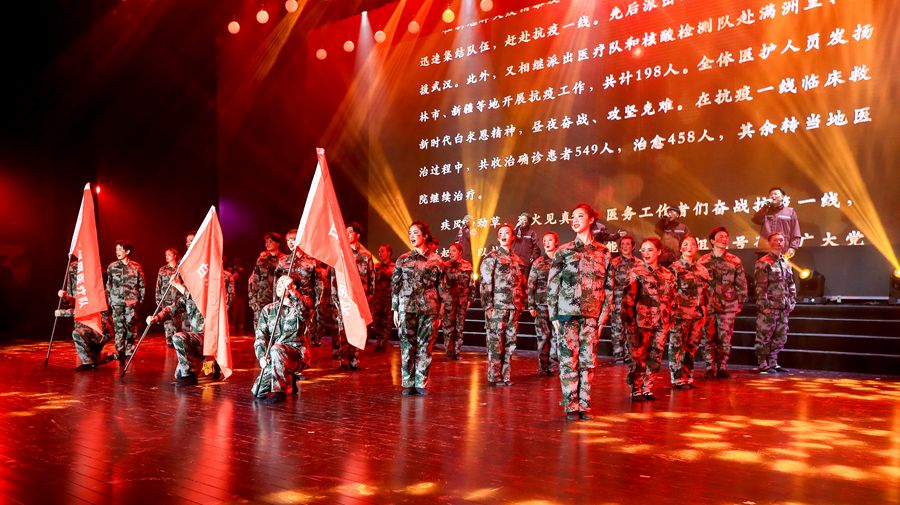 第四篇章《屹立东方》表现了公司秉承“求实创新、励志图强”的校训和“人比山高,脚比路长”的品质,各项事业都取得巨大的进步。《第一课》通过模拟第一节课的形式来讲述吉大特色学科的发展实绩。《疫路同心》和《龙耀东方》是根据今年吉大驰援武汉抗疫医疗队的事迹增设的节目,在真实感人的情景剧中展现出公司医务工作者勇于担当、无私奉献、为国为民的精神。一首《吉人天下》曲词激昂、声彻九霄,将现场气氛推向高潮,赢得在场观众阵阵掌声。
