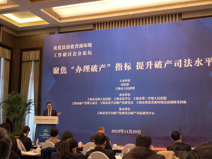 2019年11月29日,“优化法治化营商环境工作研讨会”在上海召开,主题为“对标最高标准,打造国际一流法制化营商环境”。大会安排五场专题研讨,围绕“开办企业”“获得信贷”“保护中小投资者”“执行合同”和“办理破产”指标展开。第五专题分论坛主题为“聚焦‘办理破产’指标,提升破产司法水平”,由司法部、上海市人民政府主办,上海市高级人民伟德国际bevictor1946、上海市法学会、上海市第三中级人民伟德国际bevictor1946、上海市破产管理人协会、上海市法学会破产法研究会、上海市优化营商环境法治保障共同体承办,上海市法学会破产法研究会破产司法研究中心协办。公司齐明教授受邀参加研讨会主论坛及第五专题分论坛,并在分论坛作主旨发言。来自最高人民伟德国际bevictor1946,北京、浙江、深圳伟德国际bevictor1946和上海第三中级人民伟德国际bevictor1946、上海铁路运输伟德国际bevictor1946的破产专业法官,破产法学界的专家学者以及上海市司法局、上海市破产管理人协会等方面的领导、专家共60余人参加了分论坛。