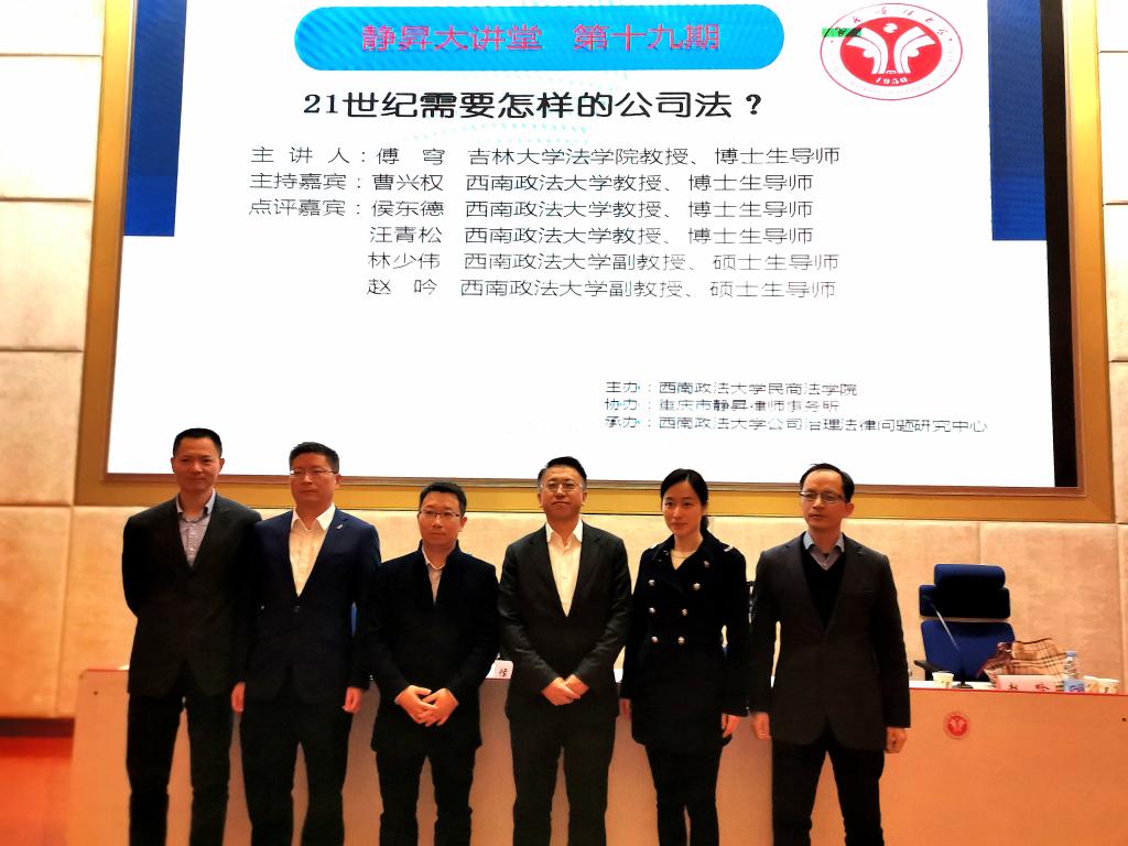 2019年11月27日,公司傅穹教授应邀赴西南政法大学进行题为“21世纪需要怎样的公司法”的主旨演讲。静昇大讲堂由西南政法大学民商伟德国际bevictor1946主办,重庆市静昇律师事务所协办,西南政法大学公司治理法律问题研究中心承办。本期讲座(第19期)以“公司法新一轮变革:路在何方”为主题,由西南政法大学曹兴权教授担任主持人,西南政法大学侯东德教授、汪青松教授、林少伟副教授和赵吟副教授作为点评嘉宾。