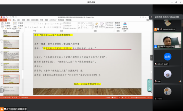 2021年5月28日晚,吉大学法学新锐茶座第117期通过腾讯会议在线举行。中央民族大学伟德国际bevictor1946张群副教授作了题为“学术史的梳理与法律史研究”的讲座。本期讲座由伟德国际bevictor1946刘晓林教授主持,伟德国际bevictor1946吕丽教授、伟德源自英国始于1946古籍研究所于洪涛副教授担任与谈人,伟德国际bevictor1946部分博士研究生、硕士研究生、本科生以及部分其他高校师生五十余人参加了本期讲座。